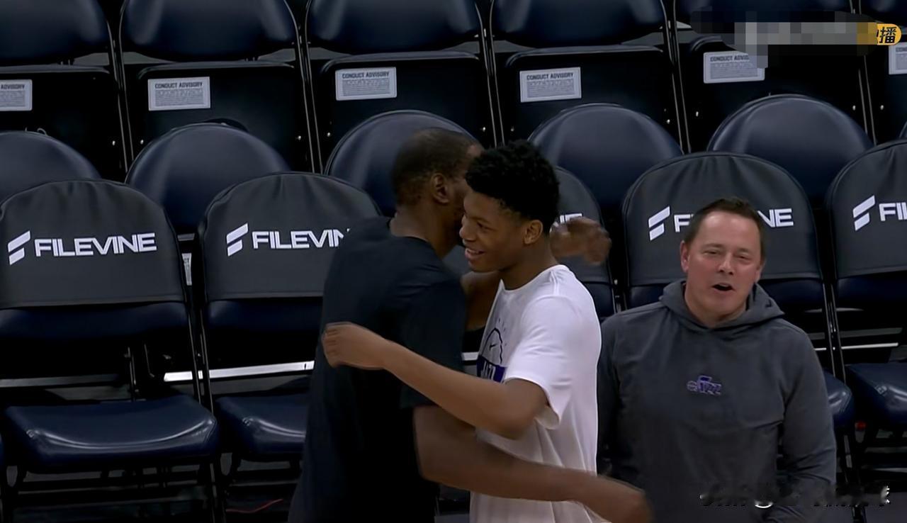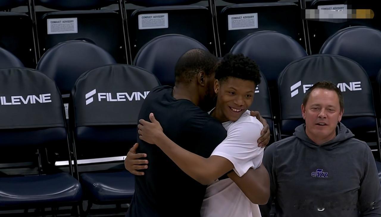 在今天爵士主场迎战火箭的赛前,发生了特别有趣的一幕。在双方的赛前热身中,爵士新秀贝利得到了和偶像杜兰特拥抱致意的机会,这下可把贝利给高兴坏了,面对镜头贝利笑得合不拢嘴。在兴奋之余,贝利还有些受宠若惊,他的眼神里透露着不可思议,场面看起来特别有趣。