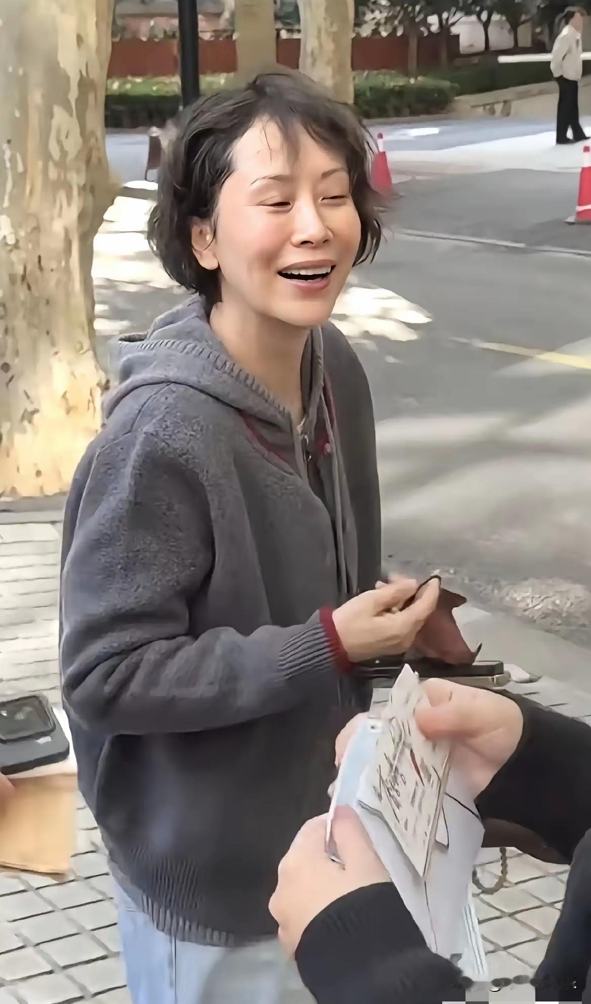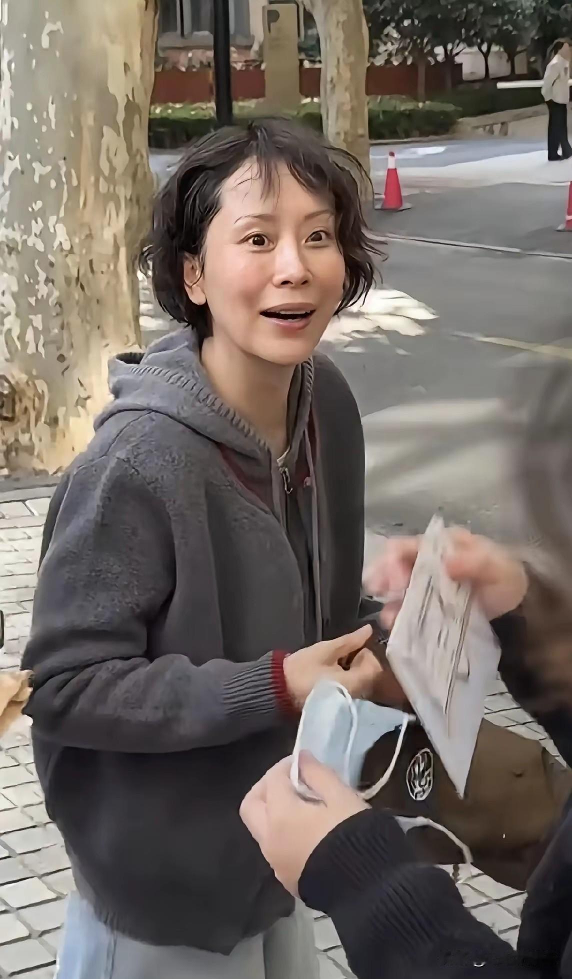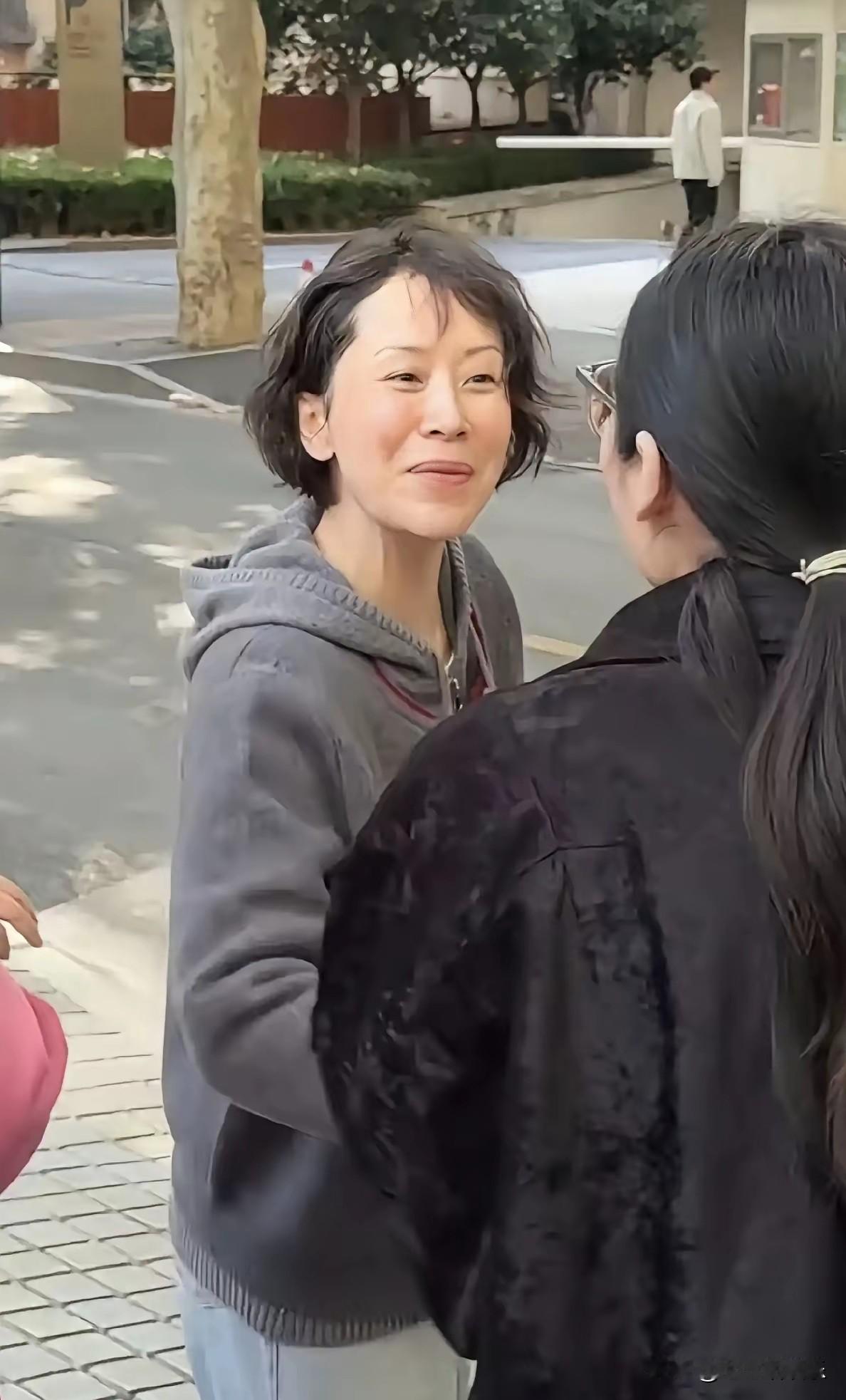 海青还是海青! 海青一件带帽灰色毛衣,浅色牛仔裤简单随意,短发虽有些零乱,但神采飞扬。皮肤光洁紧致。和人热情交谈。她还是她,和戏里一样鲜活美丽!你喜欢海青吗?