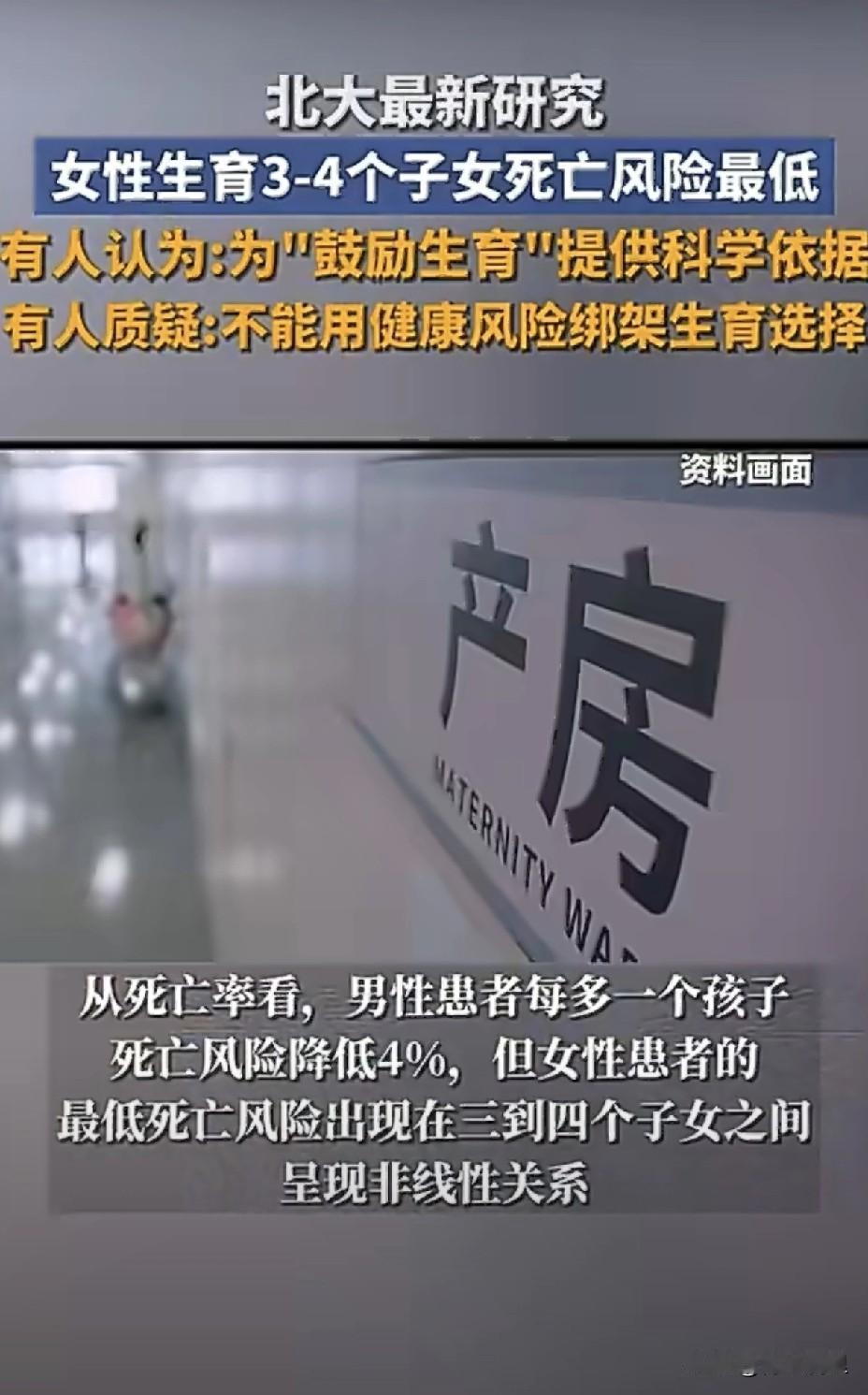 看到一篇新闻报道,说子女的数量跟爸妈的健康是有关系的,还挺复杂。简单来讲就是,女性如果一辈子不生孩子话,得精神疾病或者心脏方面的疾病的风险会更高一点。每多生一个孩子,女性得乳腺癌的风险会降低差不多18%,对男性来说,每多一个孩子,死亡风险会降低4%左右。 看到这个报道真不知道说些啥好了。人生以来,头一次听说,多生孩子还有这种好事。