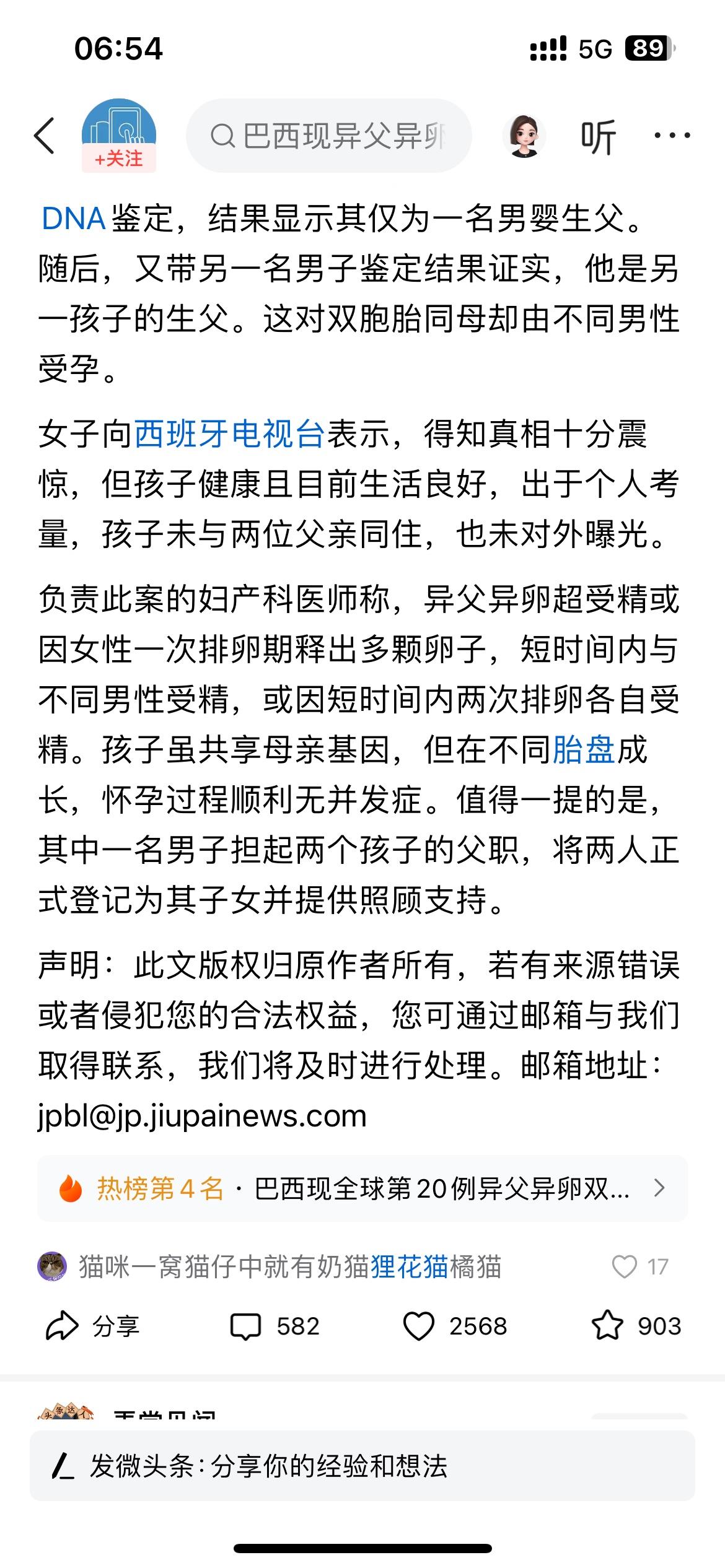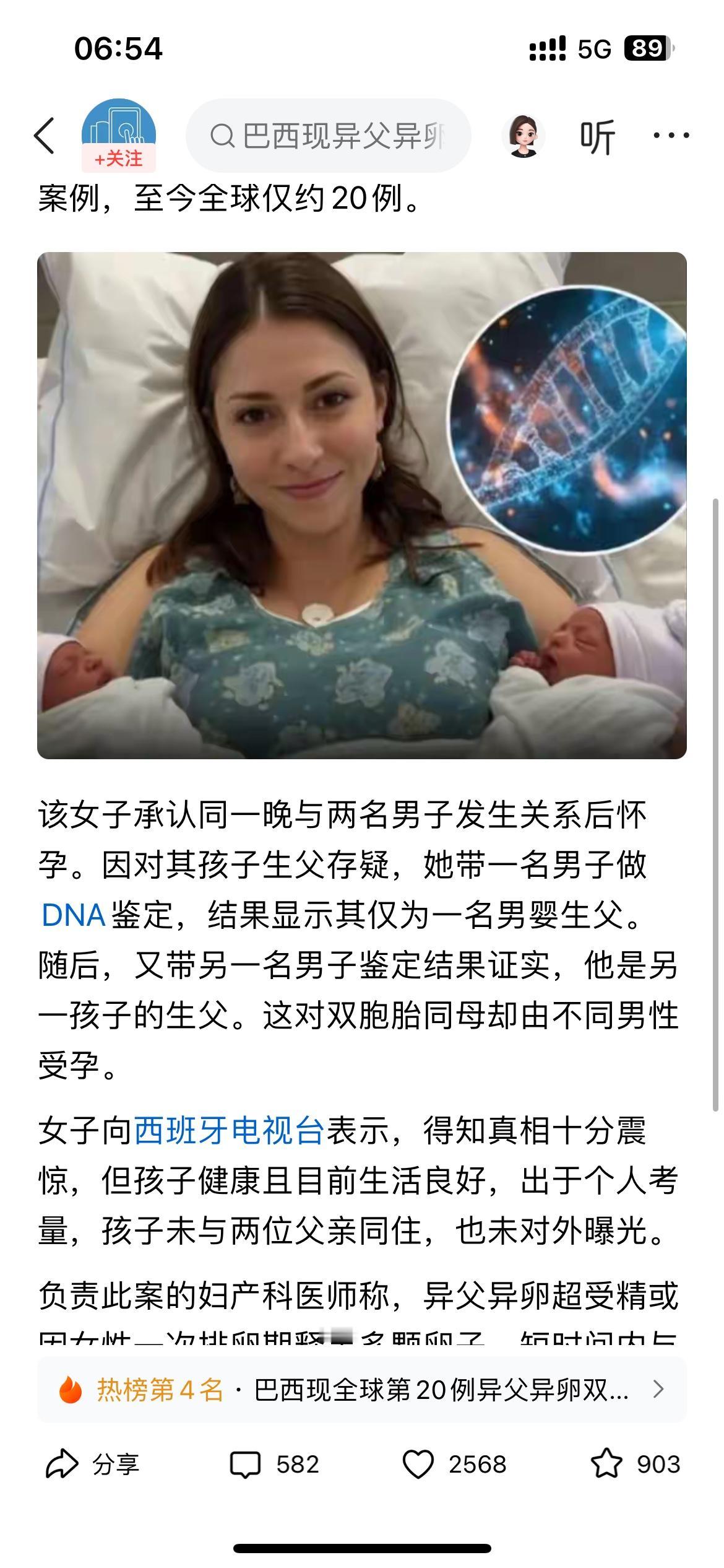 目前全球仅20例“异父异卵超受精”体,就是“双胞胎是不一个爹”,这可真是超级“奇闻”。 巴西女子产下“不同父亲”的双胞胎,就是所谓的“异父异卵超受精”,此女子需要在很短的时间内和不同男子发生关系才可以“中标”!目前全球仅约20例,果然是“少见之少见”! 此女子承认同一晚上与两名男子发生关系后怀孕,因对孩子生父存疑,她带一名男子做DNA鉴定,结果显示其仅为一名男婴的生父,然后其又带另一名男子做鉴定,结果证实这名男子是另一孩子的生父,看来孩子是谁的不是谁的,任何时候,做不做DNA亲子鉴定,当妈的都是知道个“八九不离十”。