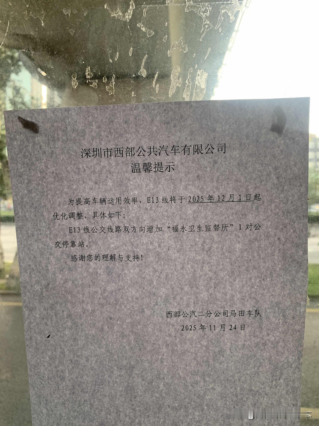 投诉真有用,深圳E13路公交车坐了5年,今天终于增加停靠福永卫生监督所站了,这是很多邻居多年来一起打电话投诉的结果,以后坐这趟走广深高速的快线到福田罗湖再也不用先转一站公交车到1公里外的怀德公元(以前的福永汽车站)了,经常在这里坐车的很多都是卫生监督所附近居民,以后去上班一个月可以省个几十一百也少转趟车还更方便了,给西部公汽点赞。深圳公交