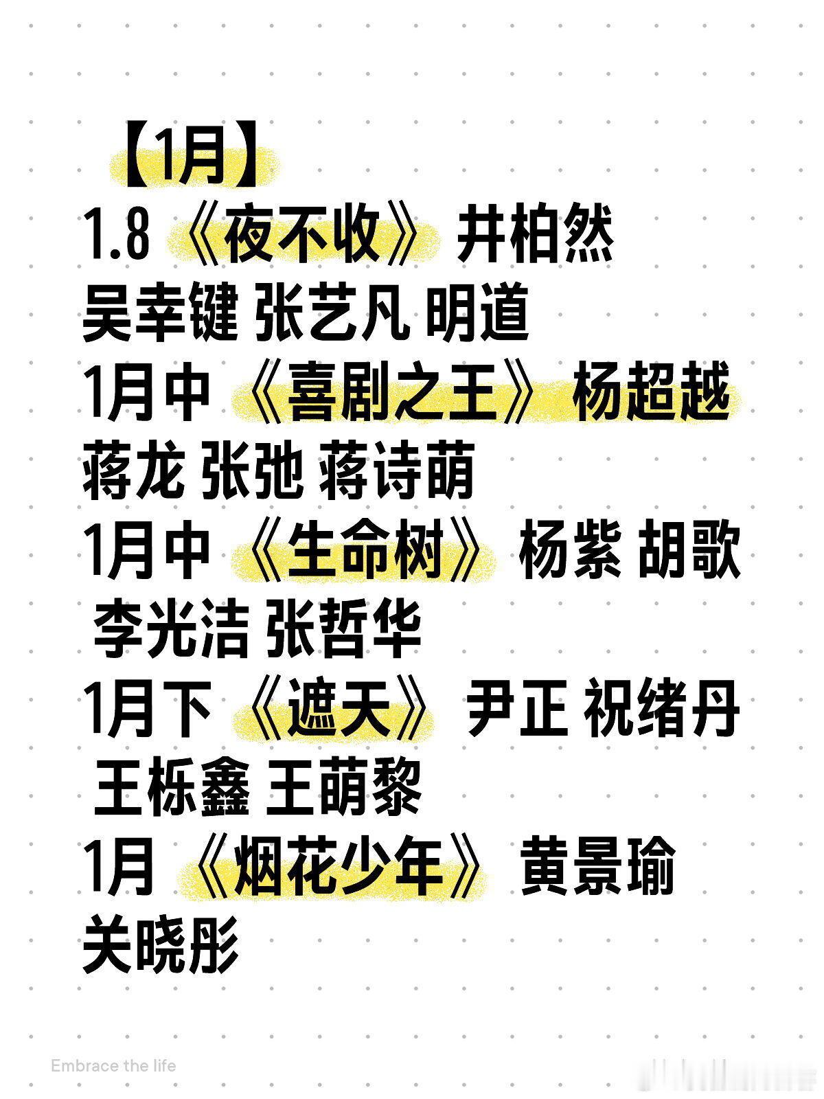🥝待播剧更新【12月】12.8《风与潮》任嘉伦 蓝盈莹 李纯 谭凯12.9《双轨》虞书欣 何与 费启鸣12月中《逍遥》谭松韵 侯明昊 汪铎 黄家婧12.15《低智商犯罪》王骁 田曦薇 王传君12月中下《唐诡奇谭》杨旭文 杨志刚 郜思雯12月下《罚罪之英雄简史》黄景瑜 王传君 梁洁12月下《轧戏》陈星旭 卢昱晓 代旭 马思超【1月】1.8《夜不收》井柏然 吴幸键 张艺凡 明道1月中《喜剧之王》杨超越 蒋龙 张弛 蒋诗萌1月中《生命树》杨紫 胡歌 李光洁 张哲华1月下《遮天》尹正 祝绪丹 王栎鑫 王萌黎1月《烟花少年》黄景瑜 关晓彤