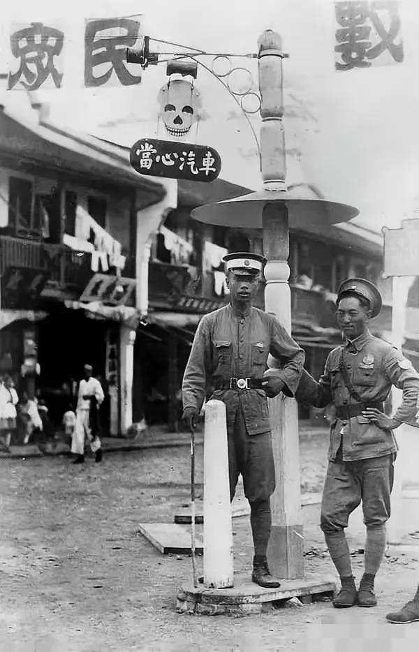 这是1929年的杭州街头,两个交通警察正在岗亭下执勤。头顶上方悬挂着骷髅标志和“小心汽车”牌子。看来那时候汽车非常少,而且汽车速度也都不慢,应该是让大家躲避汽车,把汽车当成危险的东西了。中心交警的交通岗也太简陋了,一个小石柱子下面,上面有一个小小的伞,不过,这交警的精神状态倒挺好,还是挺忠于职守的啊。