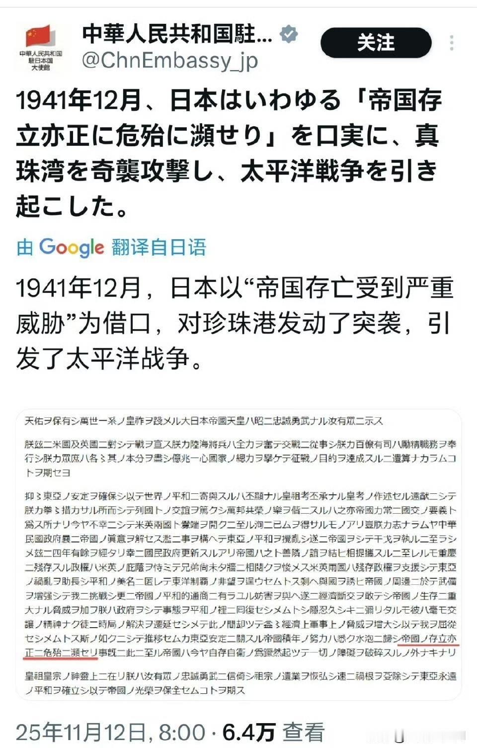 中国驻日本大使馆发帖,指出1941年12月,日本以“帝国存亡受到严重威胁”为借口,对珍珠港发动了突袭,引发了太平洋战争。