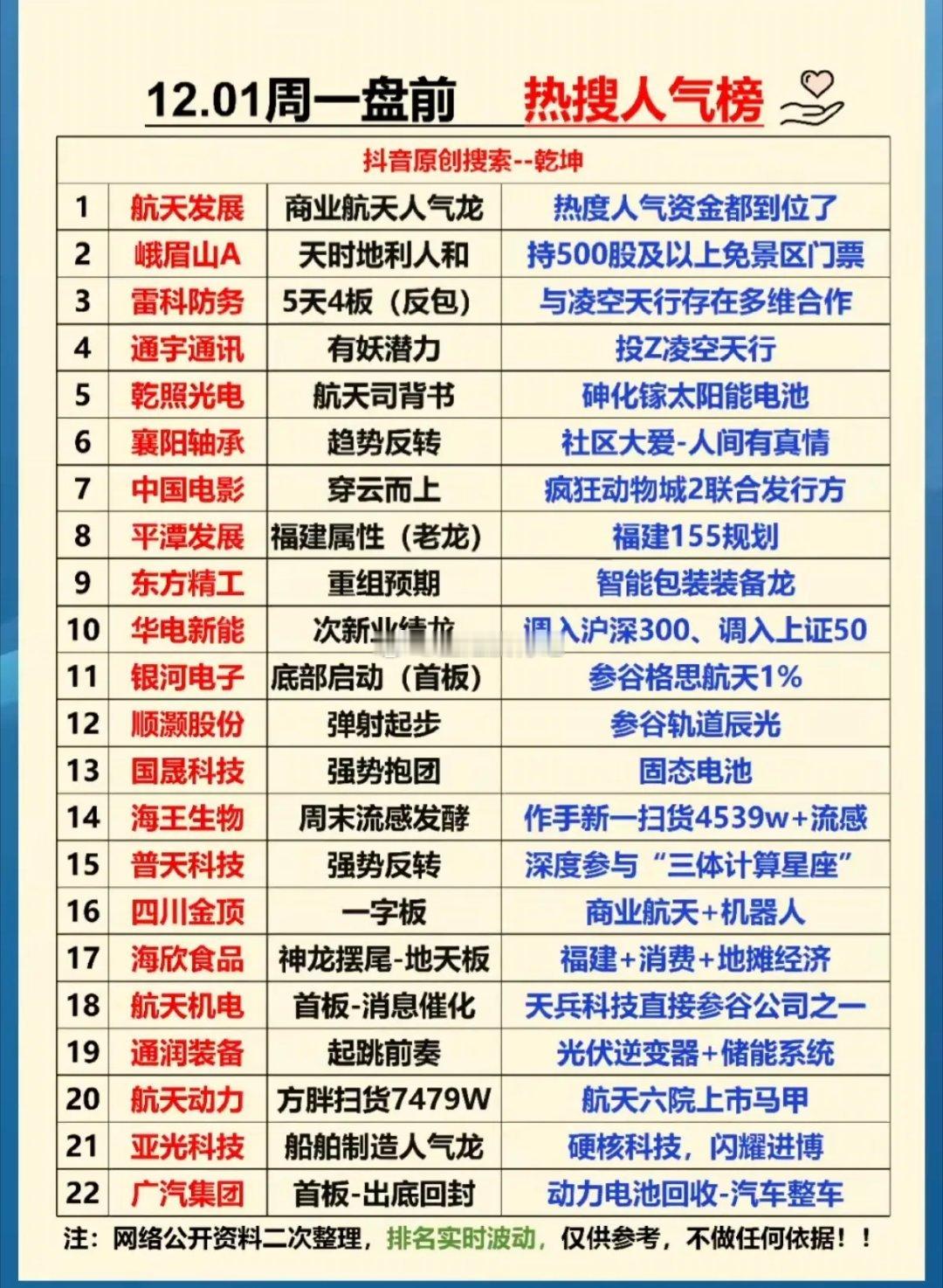 12.01周一 盘前 人气热搜排行榜!1.航天发展:商业航天,人气龙2.峨眉山A:天时地利人和持500股免门票3.雷科防务:5天4板(反包) 凌空天行4.通宇通讯:有妖潜力,投Z凌空天行5.乾照光电:砷化镓太阳能电池6.襄阳轴承:趋势反转大爱-人间有真情7.中国电影:疯狂动物城2联合发行方8.平潭发展:福建属性(老龙) 福建155规划9.东方精工:重组预期智能包装装备龙10.华电新能:调入沪深300、调入上证50