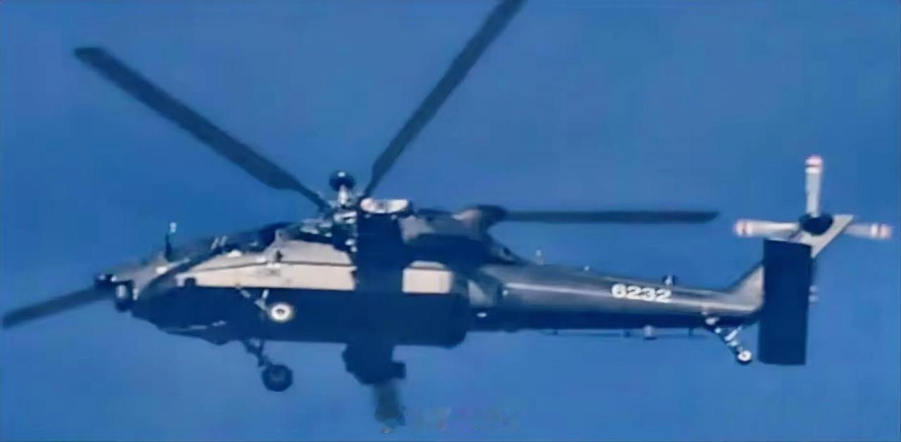 最新的重型武装直升机——直-21的清晰飞行照片。飞机已经刷上了6232的战术编号,看来已经进入作战部队使用测试阶段。机身下半截的平直机腹,是保护飞行员和机载设备的澡盆结构防弹装甲,从前座驾驶员下方一直延伸到尾梁处。还有几个清洗特征:旋翼轴上安装的毫米波雷达;向上排气的发动机尾喷口;和直-20一样的水平尾翼;上下两半的机头光电探测系统。