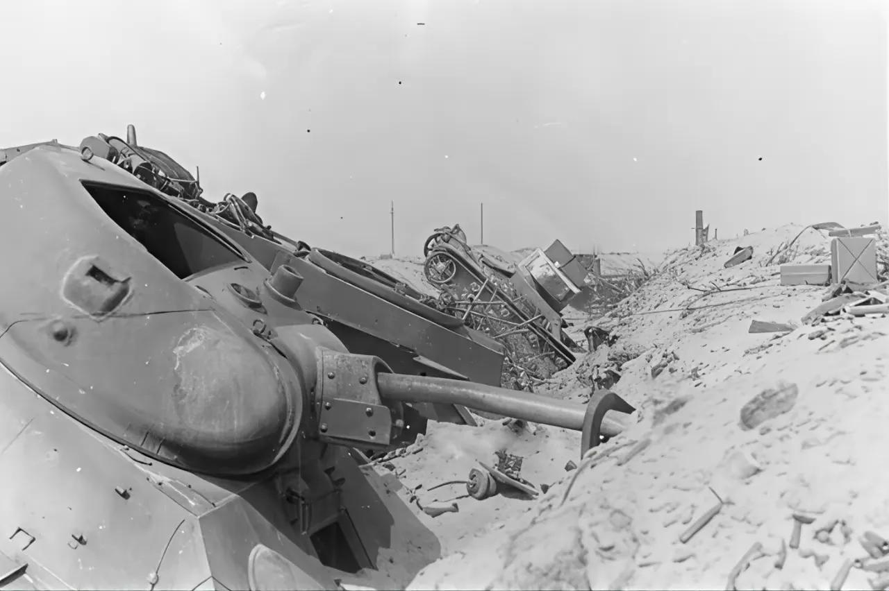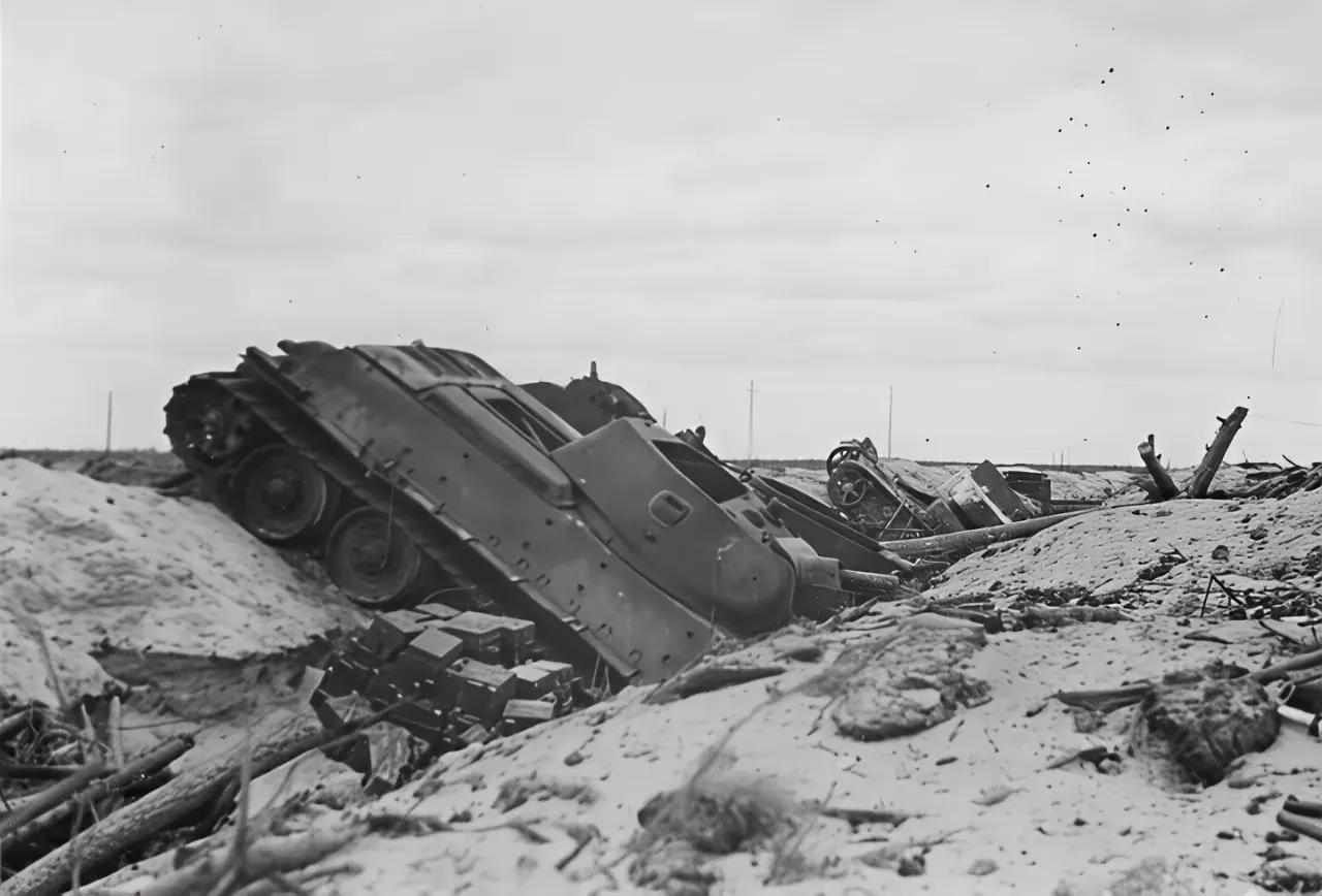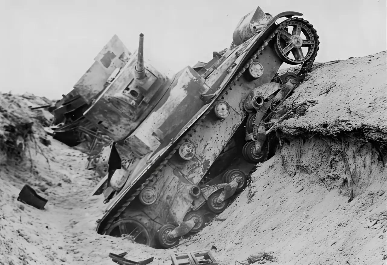 二战期间,反坦克壕沟,还是起到很大作用,这些坦克栽到这样的沟里,是无论如何也爬不上来的,现代化的战车也有土办法制服他,这就是在战争中学习战争,战术上藐视敌人,这种打法在我们八路军的游击战中也屡见不鲜。
