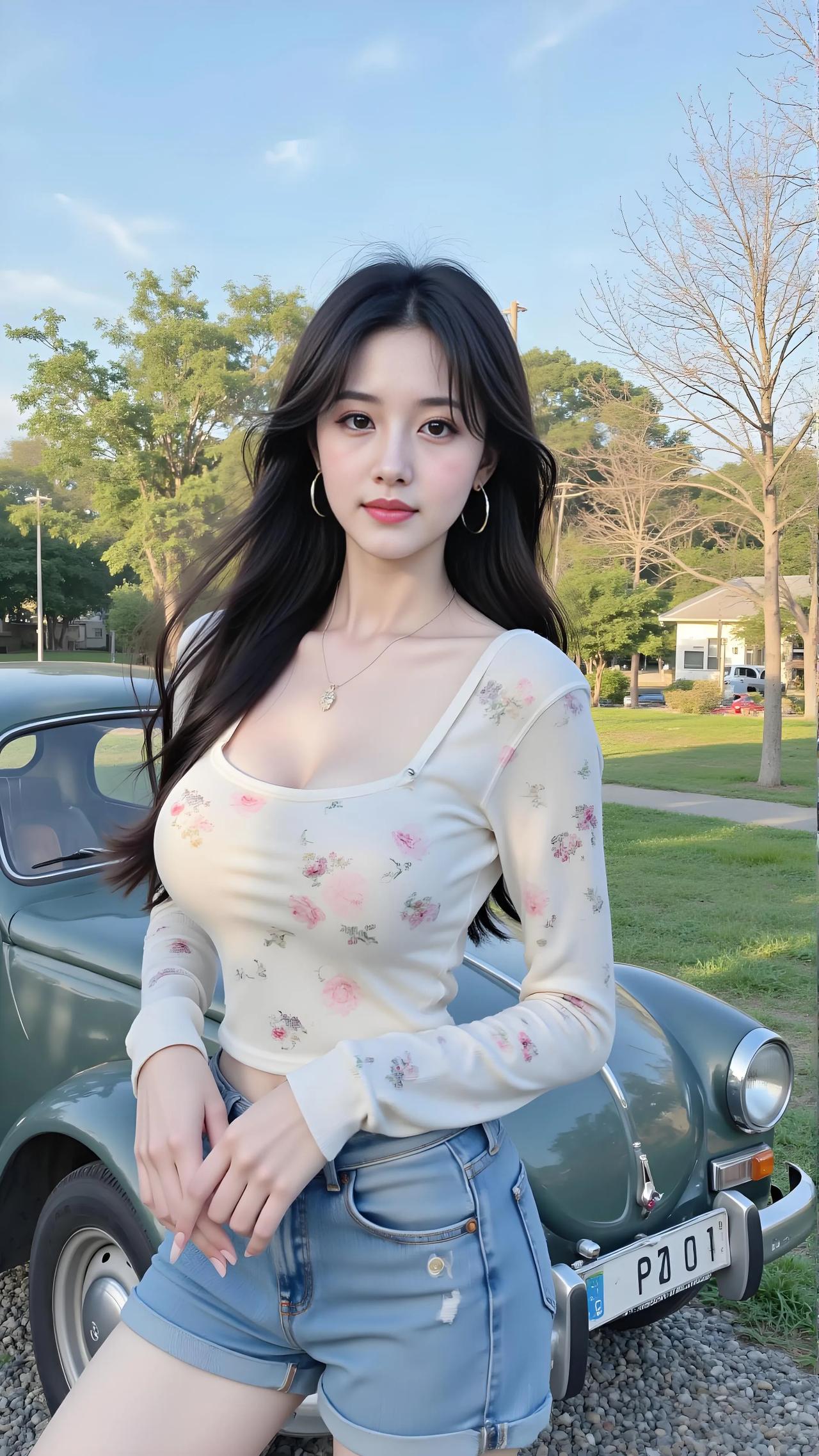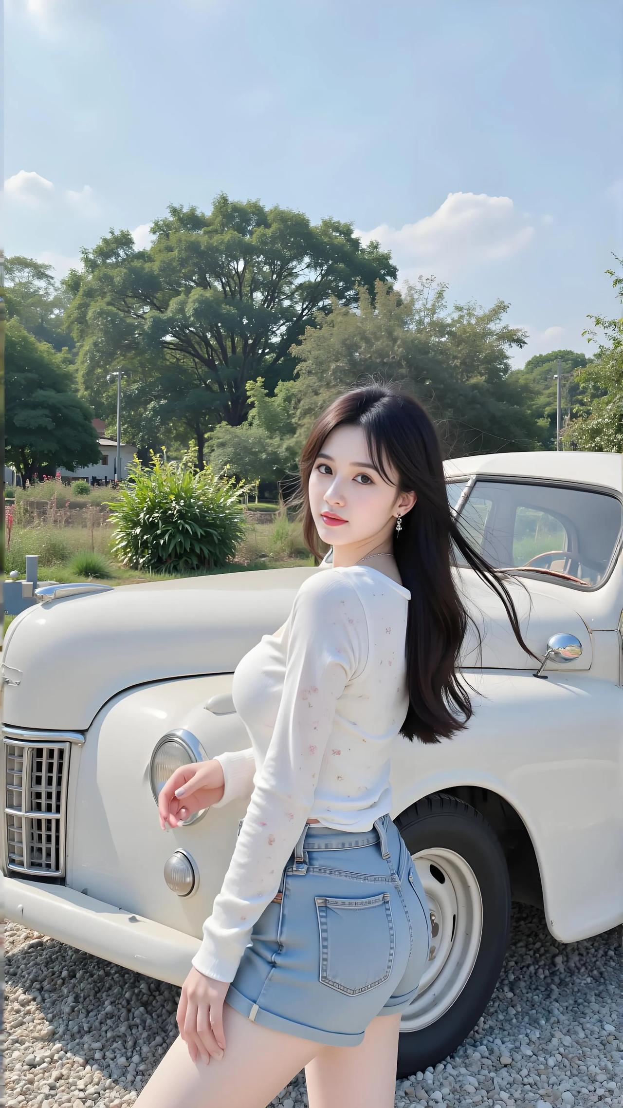 米白绣花针织衫勾勒柔美曲线,浅蓝破洞牛仔短裤尽显修长双腿,她立于复古蓝轿车旁,长发随风轻扬。淡蓝牛仔短裤