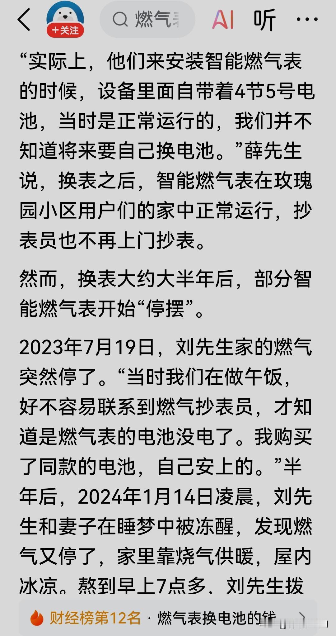 这个官司真该打一打,智能燃气表内的电池让用户承担,恐怕不仅仅这一家。燃气表由机械表,转为智能表,真正受益的是燃气公司,节约了人工成本。 然而,现在的情况是:燃气表电池无电,或者电池电量低时,燃气就自动关阀,这也太霸王条款了吧!所以,支持燃气用户与燃气公司打官司,智能燃气表电池更换的费用理应由燃气公司负责任。