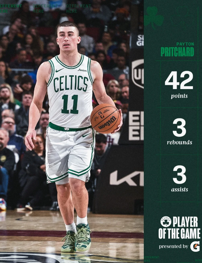 NBA常规赛,凯尔特人以117-115击败骑士。 赛后,凯尔特人官方更新X,晒出一张凯尔特人球员佩顿-普里查德的赛场照与球迷分享。 “佩顿-普里查德今天打出了超级表现,这让其当选为本场最佳球员。”凯尔特人官方附文道。 本场比赛,佩顿-普里查德出场31分钟,得到42分3篮板3助攻,投篮22中15。