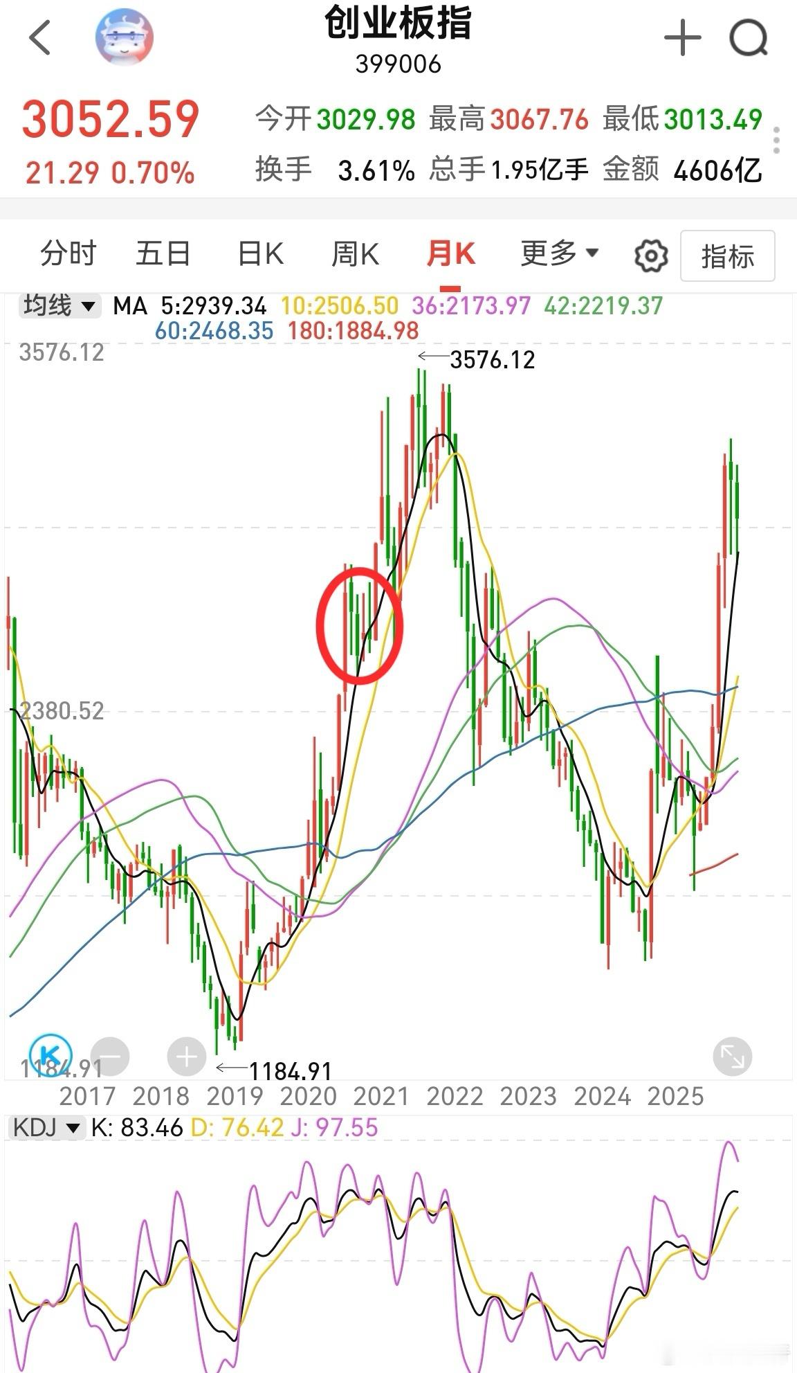 从月线看,创业板跟2020年10月份很像,趋势相当。k线组合也类似。所以说,预计