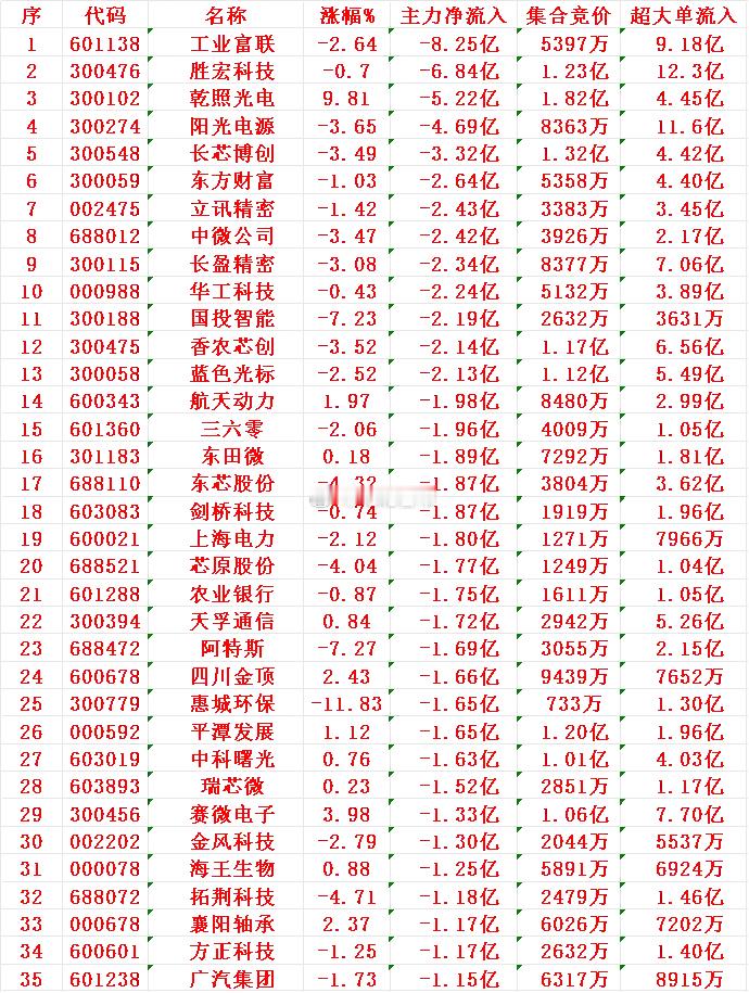12月1日开盘45分钟,主力资金“卖出的 ”35名单!工业富联:净流入 -8.25亿元胜宏科技:净流入 -6.84亿元乾照光电:净流入 -5.22亿元阳光电源:净流入 -4.69亿元长芯博创:净流入 -3.32亿元