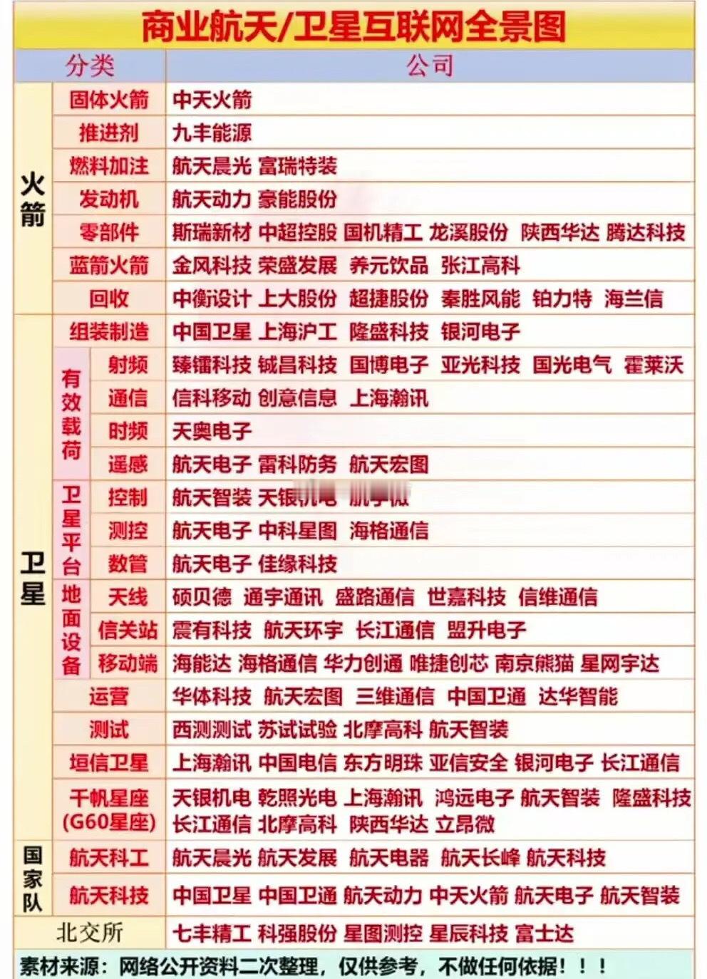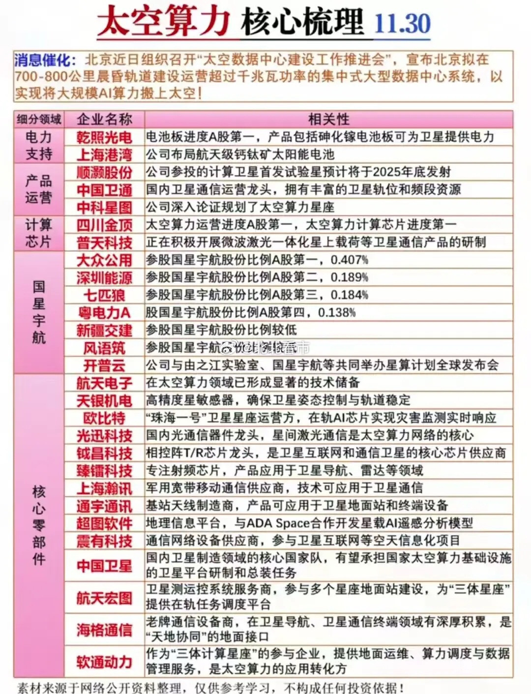 商业航天产业链核心龙头梳理!题材概念驱动事件:11月29日消息,国家航天局已设立商业航天司并开展相关业务,并发布《推进商业航天高质量安全发展行动计划(2025—2027年)》。相关概念人气龙头代表:航天发展、银河电子、航天环宇、雷科防务、通宇通讯。另外,北京又要建太空数据中心,把AI算力搬上700公里轨道,电力、芯片、核心部件的相关玩家也都安排得明明白白。这波航天+科技的联动,是不是有点未来已来那味儿了?太空算力概念龙头代表:乾照光电、中国卫通、普天科技等等。理财有风险入市需谨慎!