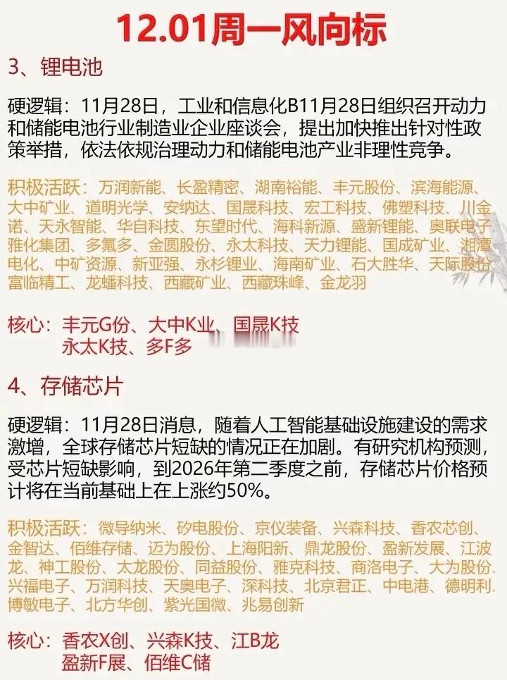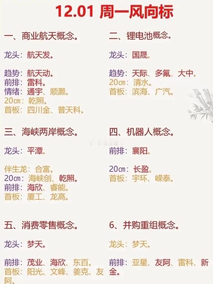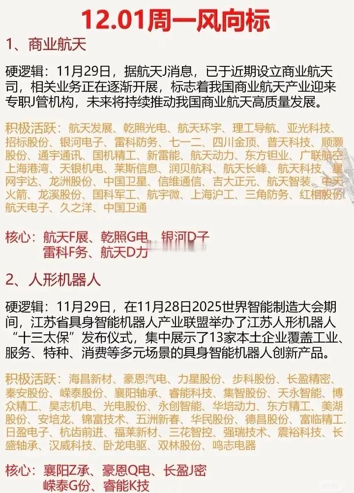 12.01周一大事件:锂电池与存储芯片行业风向标!"航天锂电领涨,机器人消费活跃,重组概念升温,龙头股表现亮眼,市场情绪向好。"