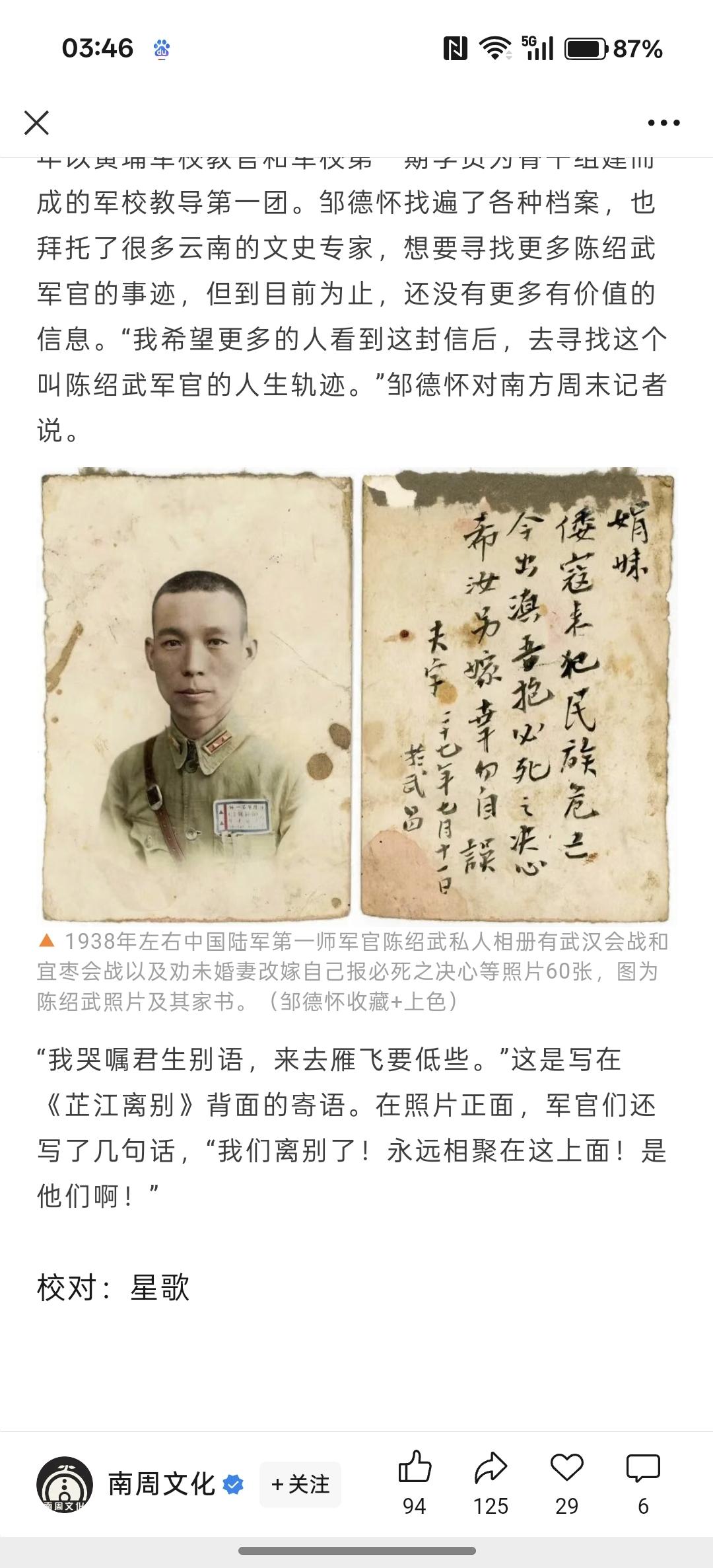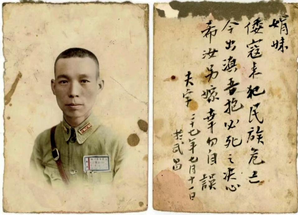 ,陆军第一师陈绍武临上前线时留给夫婚妻的一张照片,在照片背后写了:娟妹,倭寇来犯,民族危亡,今出滇吾抱必死之决心,希汝另嫁,幸勿自误!