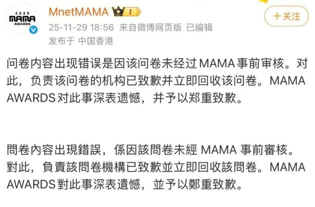 11月29晚,亚洲音乐颁奖礼(MAMA)上,主办方把香港、台湾列为“国籍”选项,引发现场的强烈不满,随后,主办方虽然发表道歉,但也难掩其认知缺失。   这起看似偶然的失误,实则是历史错误的再次重演。   据网友梳理,MAMA颁奖礼在8年内已经三次出现同类严重错误。 最早可追溯到2017年,当时其官网投票页面就公然将港澳台地区列为“国家”,引发过一轮舆论谴责,主办方当时发表道歉声明后便无下文。   除了这次和2017年的错误,期间还有一次同类违规事件未被详细披露,三次错误的反复出现,让“偶然疏忽”的辩解失去了说服力。   更值得一提的是,即便本次活动举办期间,主办方为香港进行了捐款,也丝毫没有改变其在原则问题上的漠视态度,这种将商业示好与主权认知割裂开的行为,更让公众感到不满。   事件发酵后,主办方在11月29日通过官方微博紧急发布了简体和繁体两个版本的道歉声明。   声明中仅笼统提及“内容出现错误”,将责任完全推给负责问卷的第三方机构,称错误源于“问卷未经过MAMA事前审核”,同时表示第三方机构已致歉,且已将问题问卷全部回收。   这份仓促的道歉存在明显的漏洞,既没有正面承认香港、台湾是中国不可分割的一部分这一核心事实,也回避了主办方自身的主体审核责任。   11月30日,新加坡《联合早报》对该事件进行了报道,重点引述了主办方“未事前审核”的官方说辞,这一苍白的解释经外媒传播后,进一步引发了国际社会对该事件的关注与质疑。   随着事件的持续发酵,来自媒体和民间的声讨声浪不断高涨。   国内外舆论纷纷指出,将香港、台湾列为“国籍”选项,绝非简单的笔误,而是公然挑战中国主权底线、制造分裂的行为。   舆论普遍否定了主办方“偶然疏忽”的辩解,认为这种低级错误背后更可能是别有用心的刻意为之,而主办方轻飘飘的道歉,不过是想蒙混过关的荒谬之举。   民间的愤怒情绪更是直接转化为明确的诉求,大量民众呼吁对MAMA颁奖礼采取取缔或抵制措施,要求将其逐出中国市场,并依法追究相关责任人的责任。   人们用“挑事”这样直白的词汇批判主办方的行径,用“所谓的颁奖典礼”表达对其的否定,字里行间满是对这种毫无底线行为的强烈不满。   文化娱乐产业的发展始终不能脱离国家主权与社会现实的根基,这是国际文娱行业进入中国市场的基本前提。   MAMA颁奖礼作为具有广泛影响力的国际音乐活动,屡次在主权问题上犯错,暴露的不仅是工作上的疏漏,更是对中国国家主权和领土完整的漠视。   主办方虽然发表道歉,但也难掩其认知缺失,三次错误和敷衍的道歉足以证明,他们并未真正重视中国的核心利益和民众的情感。   中国网民对这类触碰原则底线的行为始终保持零容忍态度,即便主办方有商业捐赠等示好举动,也无法抵消其在主权问题上犯下的错误。   国际文娱公司想要在庞大的中国市场立足发展,必须先学会尊重中国的国家利益,尊重中国人民坚守的原则底线。   香港和台湾永远是中国的领土,世界上只有一个中国,这是不容任何组织和个人歪曲、挑战的铁一般的事实。   今天的分享到这里就结束了,大家对此事有何看法,欢迎在评论区留言和讨论,感兴趣的可以点击头像加关注,我将每日更新优质内容,我们下期见。
