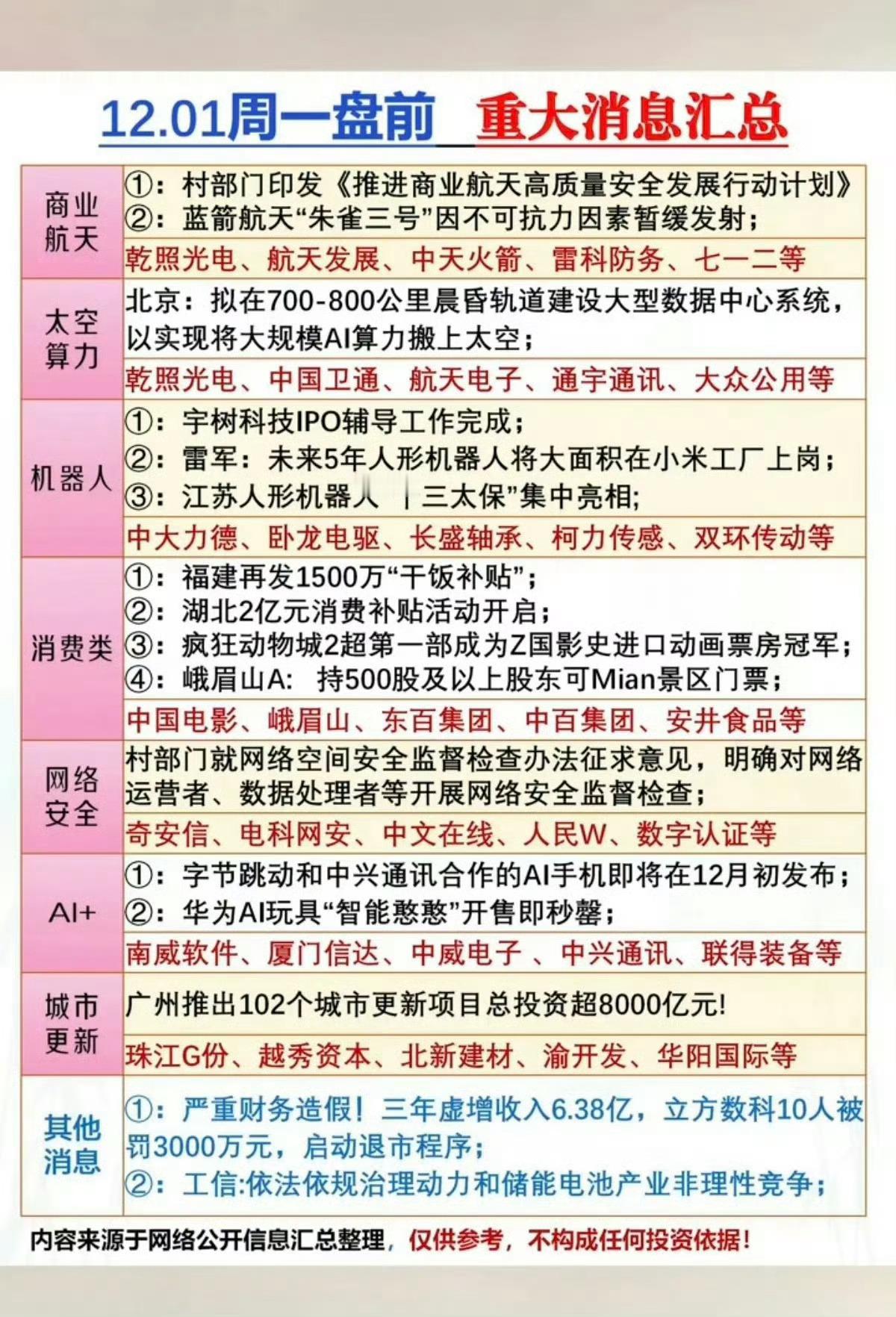 12.01周一 盘前 重大消息汇总!1.商业航天2.太空算力3.机器人4.消费零售5.网络安全6.人工智能ai+