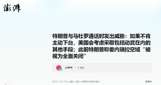 若不辞职,后果自负!特朗普发出警告! 特朗普对委内瑞拉这回是彻底撕下面子了,连迂回的客套话都懒得说。就在上周,美国总统特朗普直接给委内瑞拉总统马杜罗打去电话,话里话外全是硬邦邦的威胁。 你要是识相主动辞职,这事还好商量;要是敢硬扛着不走,美国有的是办法收拾你,动武都不是没可能。这话可是《华尔街日报》援引消息人士爆出来的,后续《迈阿密先驱报》还扒出了更具体的通话细节,可信度实打实的。 说起来,这通电话本身就透着诡异。要知道之前美国对马杜罗的态度,那是连正眼都懒得给,直接扶持反对派当“临时总统”,各种制裁更是没断过。 现在突然直接通话,不是要缓和关系,而是上门逼宫,可见特朗普是觉得“极限施压”到火候了。白宫在电话里给马杜罗开了“条件”:主动辞职,然后带着家人安全离开委内瑞拉,这就是美方给的“后路”。 可马杜罗也没软着接招,直接提了三个反条件:要给自个儿和核心支持者搞全球大赦,还得保留对委内瑞拉军队的控制权。这几条全戳在美国的痛处上,自然被美方一口回绝,通话最后不欢而散。 特朗普挂了电话就开始摆架势,显然是早就做好了施压的准备。11月29日他突然在社交媒体上放话,说“委内瑞拉上空及周边空域被视为全面关闭”,这话一出来,全世界都猜美国是不是要动手了。 虽然他后来又含糊其辞地说“别乱解读”,但这种先放狠话再留余地的套路,正是他一贯的风格。 更实在的动作在军事部署上,美国早就把最大的航空母舰“福特”号派到了委内瑞拉附近的加勒比海域,9月初以来,以“缉毒”为名,在周边海域击沉了二十多艘所谓的“贩毒船”,八十多人因此丧命。 明眼人都清楚,“缉毒”不过是个由头,美国缉毒署自己的报告都显示,委内瑞拉压根不是美国毒品的主要来源地。除了军事上亮肌肉,美国还玩起了“扣帽子”的老把戏。 前不久美国国务院直接把委内瑞拉“太阳集团”列为“外国恐怖组织”,还一口咬定马杜罗就是这个组织的头目。这步棋特别阴,等于为美国后续采取军事行动找好了法律借口——打恐怖分子,听起来就师出有名了。 特朗普本人也在感恩节对美军讲话时放风,说很快就要把针对委内瑞拉的打击行动从海上扩大到陆地,地面行动马上就来。一套组合拳下来,就是要让马杜罗知道,电话里的威胁不是空喊口号。 面对美国的咄咄逼人,马杜罗也没打算认怂。他直接穿着迷彩服亮相委内瑞拉空军成立105周年的活动,手里挥着佩剑,当着全军的面喊话:现在是决定国家存亡的时刻,要是祖国需要,我们愿意献出生命。 他不光嘴上硬,行动上也没落下,立刻召集国防部长和军方高层,重新审查国家防御计划,还要求空军24小时待命,随时准备应对外部侵略。 委内瑞拉副总统罗德里格斯更是直接戳破美国的谎言,说所谓的“缉毒”“反恐”全是幌子,美国真正想要的,是委内瑞拉的石油资源。 其实特朗普这么急着对委内瑞拉下手,背后的算盘打得很精。中国现代国际关系研究院的孙岩峰教授就点透了,美国就是想以压促变,趁着委内瑞拉国内经济不宽裕、反对派有点声势的时候,把马杜罗这个“反美钉子户”给拔掉。 这也是特朗普“新门罗主义”的套路——把拉美当成自家后院,凡是不听话的左翼政权都要收拾,同时拉拢那些亲美的右翼国家。 就在对委内瑞拉动硬的同时,美国刚和阿根廷、危地马拉这些国家签了贸易协定,给点关税优惠的“胡萝卜”,换它们对美国开放市场。 不过话说回来,美国真敢直接派兵打委内瑞拉吗?上海大学的江时学教授倒是觉得可能性不大。毕竟美国在伊拉克、阿富汗打了那么多年,没捞到好果子,委内瑞拉体量不小,真打起来代价太大。 特朗普现在这套又是威胁又是摆阵的操作,更像是“讹诈”——先用军事压力把马杜罗逼到绝境,最好能让他内部崩盘,自己下台。 现在的局势就这么僵着,特朗普那边还在持续加码,马杜罗这边也在全民备战。哥伦比亚总统佩特罗看得明白,美国闹这么大动静,根本不是为了什么民主禁毒,就是冲着委内瑞拉的石油来的。 至于马杜罗会不会像特朗普预想的那样“认怂”,目前来看可能性不大——他手里握着军队支持,又把全国民众的反美情绪调动了起来。这场电话逼宫大戏,恐怕才刚刚拉开序幕。