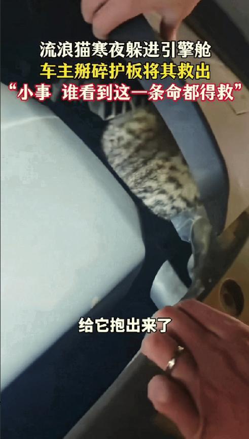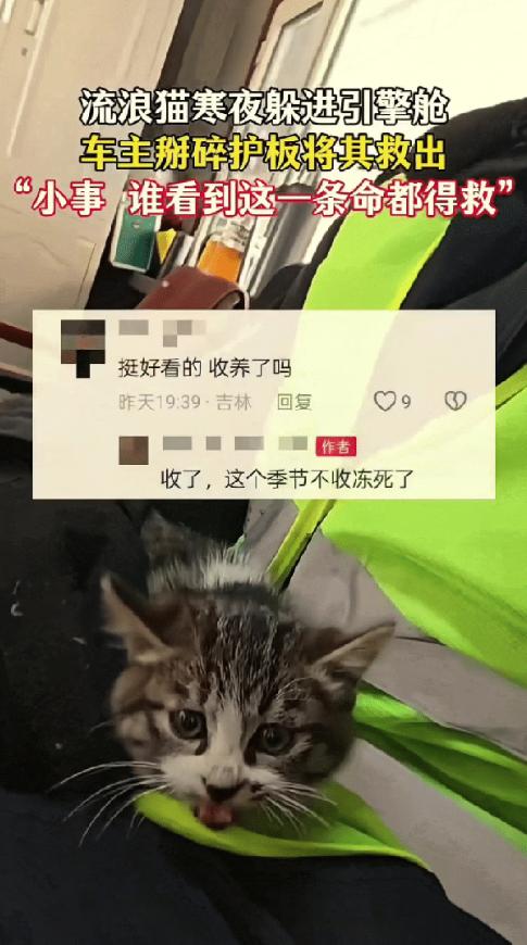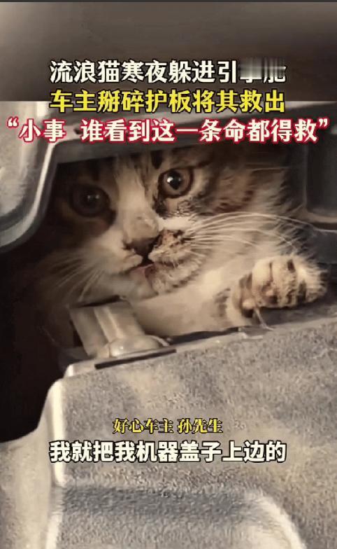 “碰到好心人啦!”吉林一位男士开车时听见车里传来猫叫,打开引擎盖后,竟发现一只小猫躲在里面取暖。本以为过一夜小猫就会自行离开,没料到第二天它还在车里,男子索性掰碎引擎盖的塑料护板,成功将小猫救下。网友打趣:这小猫挺懂行,居然知道V6发动机更暖和! 东北的冬天来得又早又猛,11月26号的吉林市,夜间气温就跌破了零下十度。 孙先生那天忙到挺晚才结束工作,走向自己停在路边的轿车,拉开车门坐进去,他准备点火,一阵若有若无的声响飘进耳朵。 那声音细细尖尖的,不像是车辆零件松动的杂音。 孙先生听着声音,推开车门绕到车头,掀开引擎盖的瞬间,他借着路边的路灯看见电瓶和大灯交界的夹缝里,缩着个小小的身影。 那是只刚断奶没多久的小奶猫,体型也就成人巴掌大小,眼睛半睁半闭的,估计是还没长开。 它的绒毛被寒气浸得发硬,全都炸了起来,整个身子缩成一团,看得出来冻得不轻。 孙先生立刻就懂了,这小家伙准是冲着发动机残留的余温钻进来的。 他试着慢慢探过手去,刚靠近,小猫就猛地绷紧身子,喉咙里发出细细的警告声,往缝隙更深处缩了缩。 夹缝空间太窄,硬拽肯定会弄伤它,况且小猫正处于应激状态,贸然动手说不定会让它卡在零件中间。 孙先生身上没带任何工具,觉得或许等引擎彻底凉了,小猫感知不到暖意,就会自己找路离开。 他轻轻把引擎盖合好,打开双闪警示灯,发动车子后特意放慢速度,生怕路上的颠簸让小猫失了支撑。 到家停稳后,他又特意蹲在车头听了会儿,里面还能传来微弱的动静,只好先上楼,打算第二天一早再来看。 第二天清晨,孙先生没敢耽搁,洗漱完就直奔楼下,他先是在车头附近轻轻跺了跺脚,又敲了敲引擎盖,等了片刻,才听见里面传来比昨晚更虚弱的叫声。 他赶紧掀开机盖,只见小猫还是维持着昨晚的姿势,只是缩得更紧了,连炸毛的力气都快没了。 这时候孙先生心里一沉,他摸了摸引擎外壳,早就没了半点温度,很明显,小猫不是不想走,是真的被困在夹缝里出不来了。 这么冷的天,再困上几个小时,就算不被饿死冻死,要是自己没注意直接启动车子,运转的零件和升高的温度,后果不堪设想。 他围着车头仔细观察了一圈,发现小猫藏身处的外侧有块塑料护板,正好挡住了大部分操作空间。 这时候联系修理厂显然来不及,孙先生咬了咬牙,决定自己动手拆。 他先用手指抠住护板边缘试了试,没撬动,随后双手抓住边缘,憋足劲往上一掰,几声清脆的“咔嚓”声过后,护板被掰开了一道缺口。 缺口打开后,操作空间一下子就够了,孙先生慢慢把手指伸进去,轻轻托住小猫的身体。 小家伙在他掌心轻得像片羽毛,浑身冰凉,连叫出声的力气都很微弱。 他低头看了看散落在地上的护板碎片,心里清楚修这块板得花不少钱,但看着掌心里这团小小的生命,压根没觉得可惜。 孙先生直接把小猫揣进怀里捂着,开车去了办公室。 到了地方,他从储物间翻出个干净的纸箱子,垫上自己备用的绒线手套,又去茶水间倒了杯温水放凉,还找同事要了点猫粮。 一开始小猫只是警惕地缩在箱子角落,过了半个多小时,感受到周围的暖气和孙先生的气息,才慢慢放松下来,试探着舔了几口温水,没过多久就蜷在绒线手套上睡着了。 之后的日子里,孙先生特意去宠物店买了幼猫猫粮和猫砂盆,工作不忙的时候,他就坐在箱子旁边,偶尔用指尖轻轻碰一碰小猫的背。 小猫也渐渐放下了戒备,从一开始的躲闪,到后来会主动凑到他手边蹭一蹭。 有同事知道了这件事,跟他打趣说为了只流浪猫弄坏车不值得,孙先生只是笑着摇摇头,说车坏了能修,可这是条活生生的命,遇上了就不能不管。 每到天寒地冻的时候,东北街头的流浪猫狗为了取暖,总会往车底或者引擎舱里钻。 他干脆用手机拍了段小猫在办公室的视频发出去,提醒身边的车主,冬天开车前多花几十秒,绕着车子走一圈,敲敲引擎盖,说不定就能给这些小生命留条活路。