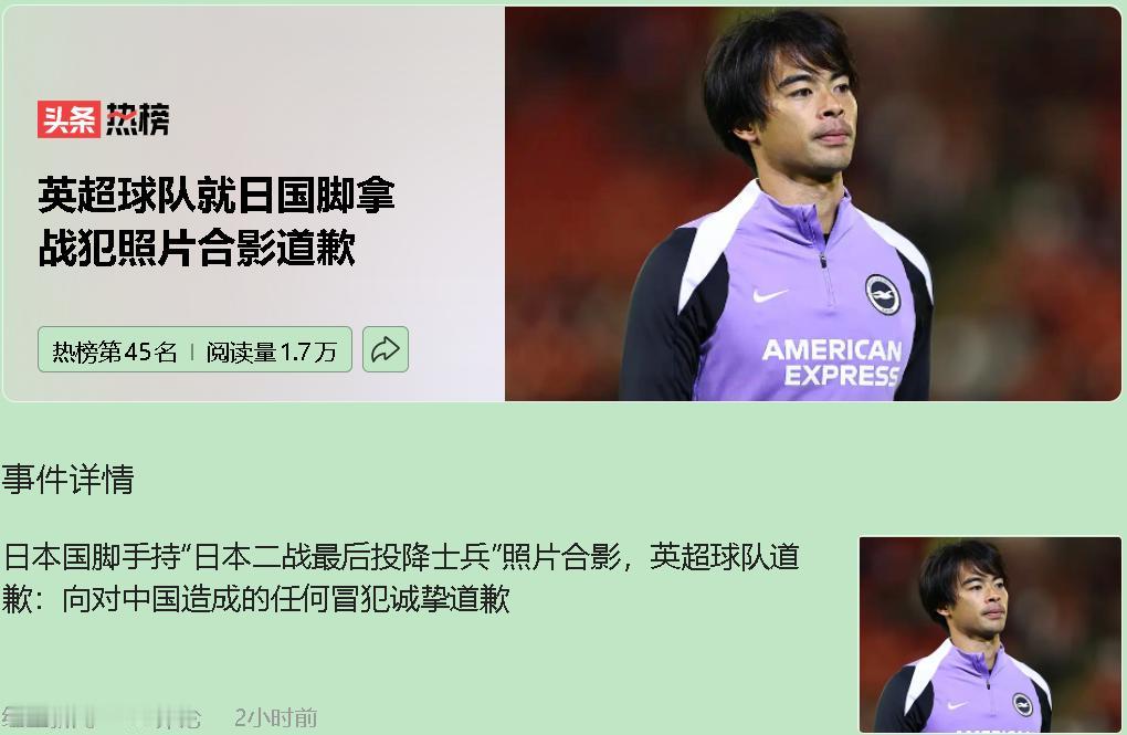 说实话,看到那张照片的瞬间,我筷子都掉了。英超球队就日国脚拿战犯照片合影道歉 纪念和平的足球赛,举着的却是一双沾满平民鲜血的手。布莱顿俱乐部这波操作,相当于在反霸凌日把施暴者请上主席台。 事情很简单:他们青训参加的"圣诞休战锦标赛",本是为纪念一战士兵放下武器踢场球的温情故事。结果三笘薰和孩子们举着的,是二战日本战犯小野田宽郎——那个在菲律宾岛上杀了三十多个平民,日本投降后还躲了29年不投降的人。 最扎心的不是犯错,是道歉的姿势。 中国球迷一抗议,俱乐部秒发声明,字里行间全是"对不起中国市场"。可真正的伤口在菲律宾啊。那边三代人的创伤,在国际舆论场里愣是成了静音模式。韩国媒体也坐不住了:殖民统治的伤疤,一句不提? 这事越想越不对劲。 第一,你说"不了解这个人",那照片哪来的?随机生成的?糊弄谁呢。 第二,三笘薰至今没开口。他不是路人甲,他是日本人,举着照片的时候笑得很开心。现在集体装失忆?这种沉默比照片本身还让人寒心。 第三,英超俱乐部的审核,就这么随便?还是亚洲历史在他们眼里,本来就是个可选项? 说到底,扯下的是那块遮羞布:对日本二战罪责,国际社会一直含糊其辞。小野田在某些人嘴里是"忠诚象征",可对受害者来说,他就是噩梦本身。 体育不分国界,但搞体育的人得长心。错了就认,挨骂就立正。这不是给哪个市场看的表演,是对历史最基本的敬畏。