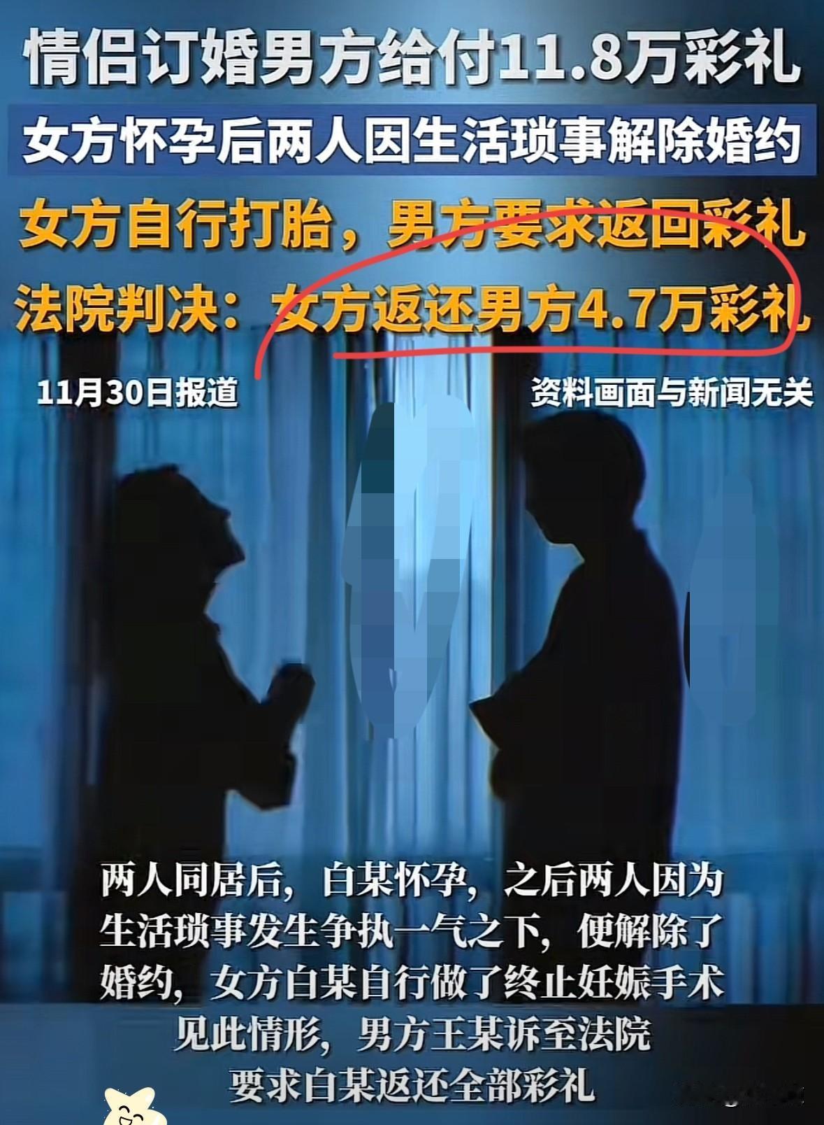 江苏无锡一对情侣订婚后同居, 女生怀孕后,因生活琐事和男生发生争执,一气之下,双方解除了婚约 女生怀孕后因琐事退婚,独自做完手术,男方却只盯着彩礼追着要,这波操作真的让人膈应! 要知道《妇女权益保障法》早明确了,女性有自主决定终止妊娠的权利,而且法院判决时,早把同居时长、身体损伤这些女方的付出都折算进去了! 彩礼本是男方的“定心礼”,是好好过日子的承诺,不是结婚的“押金”,更不能当成感情散场后的“清算筹码”! 婚姻没成双方都有遗憾,只谈钱不谈对方的牺牲,本身就背离了彩礼的初衷! 法院判返还4.7万,既没让女方白受委屈,也没让男方血本无归! 你们对此事怎么看?