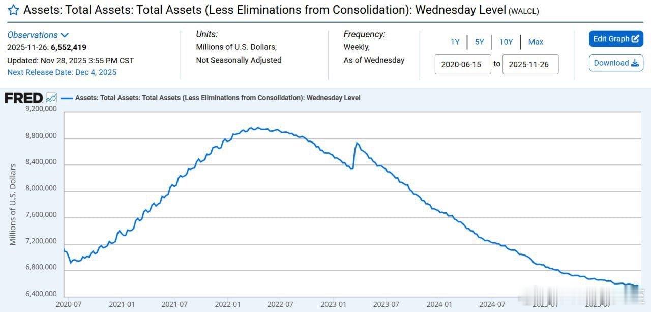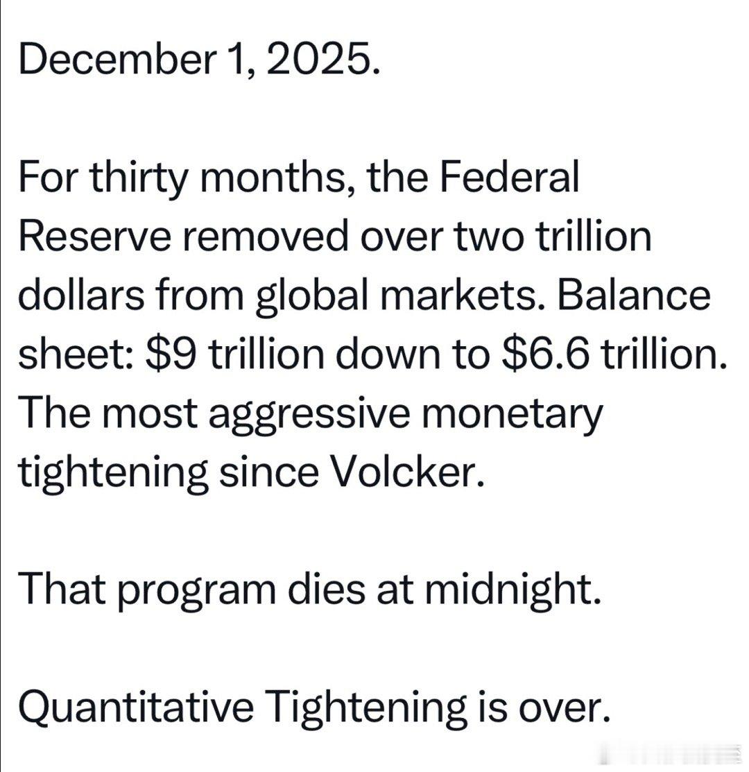美联储自2022起,已连续三十个月,进行量化紧缩,总额$2.5万亿左右明天(12月1日)结束,证券到期后会继续投资、增加流动性