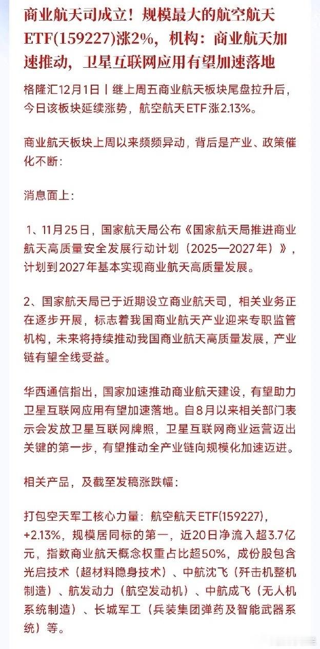 商业航天司成立了,航天ETF直接就涨起来了,商业航天意义重大成立商业航天司就是给快速壮大的商业航天产业找了个专业“大管家”,好处能直接落到企业和咱们普通人身上,以后商业航天将会覆盖到国与国之间的贸易。以后商业航天这一块肯定是有很大贸易市场,毕竟哪个国家也不会在航天这块愿意落下,巴基斯坦跟咱们飞上天不知有多少国家在羡慕,这就是航天的营销。航天也是一个几乎全是利润的买卖,基本上没有什么成本。今天商业航天这个板块也是大涨,航空航天ETF也是大涨,但是相比未来的空间来说还不算什么。
