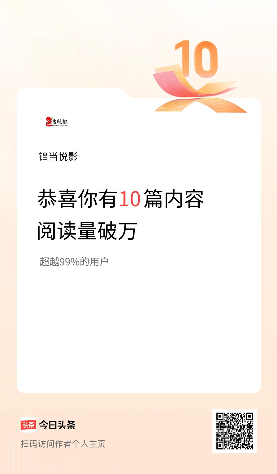 我在头条有10篇内容阅读破万了! 头条创作解锁10篇阅读破万成就!每一次数据攀升都是认可,每一份热度都藏着热爱,感恩读者的陪伴与偏爱,未来继续深耕内容,不负每份期待~