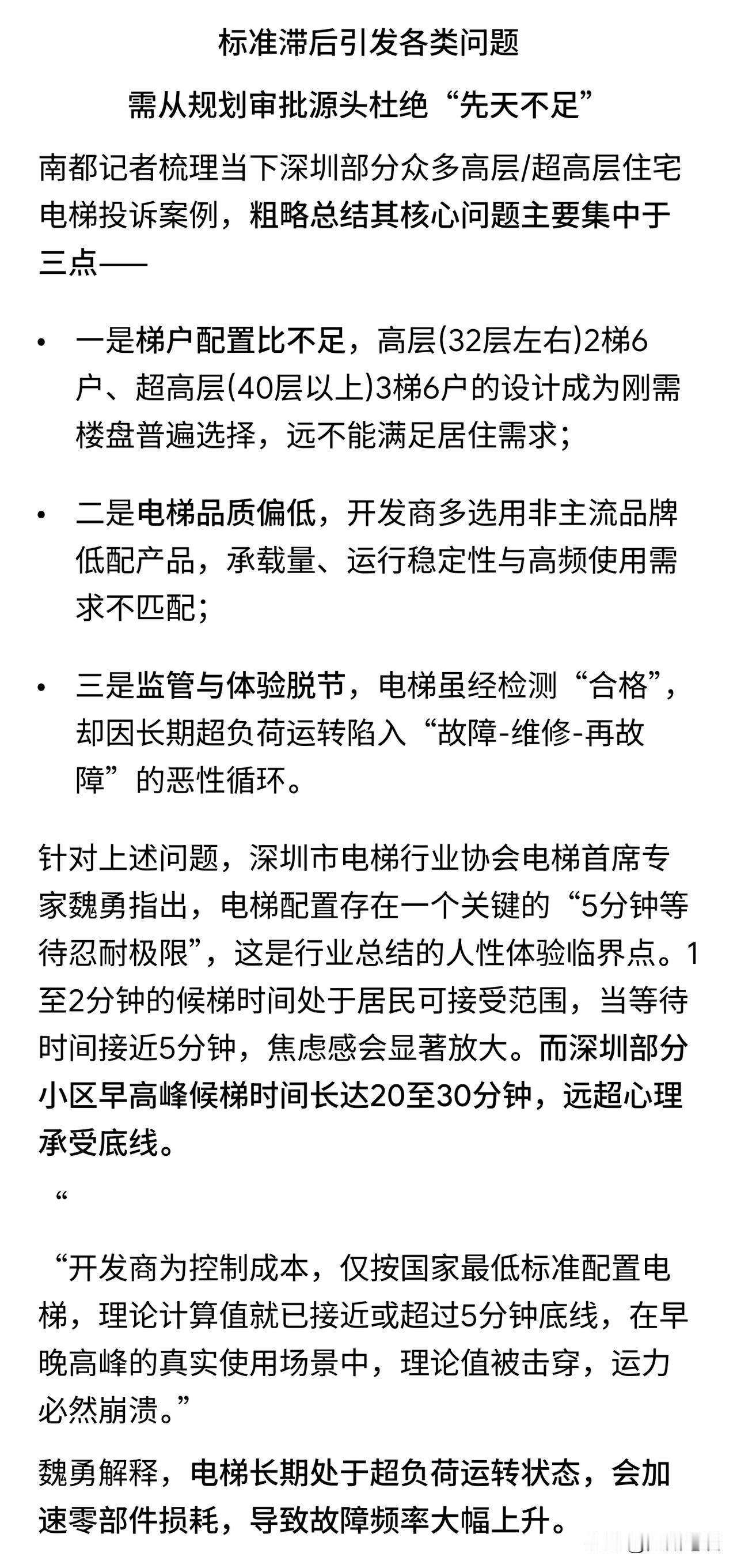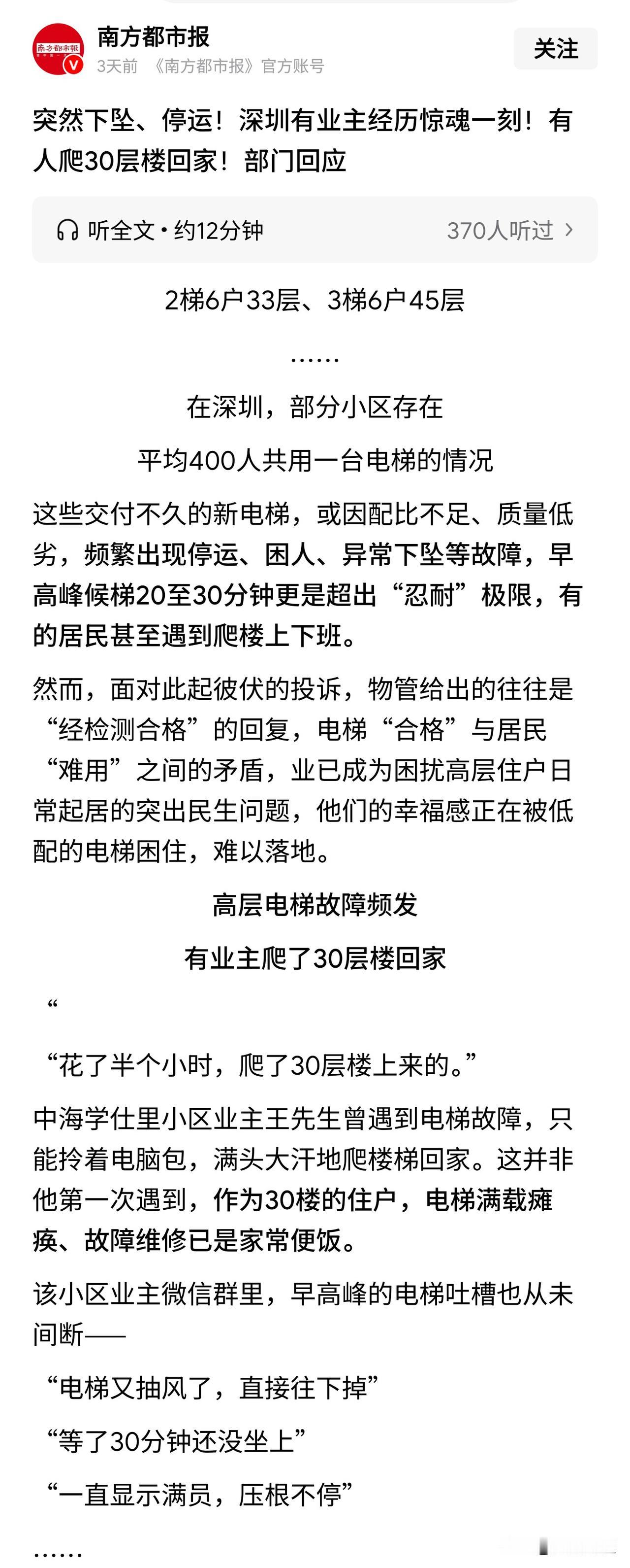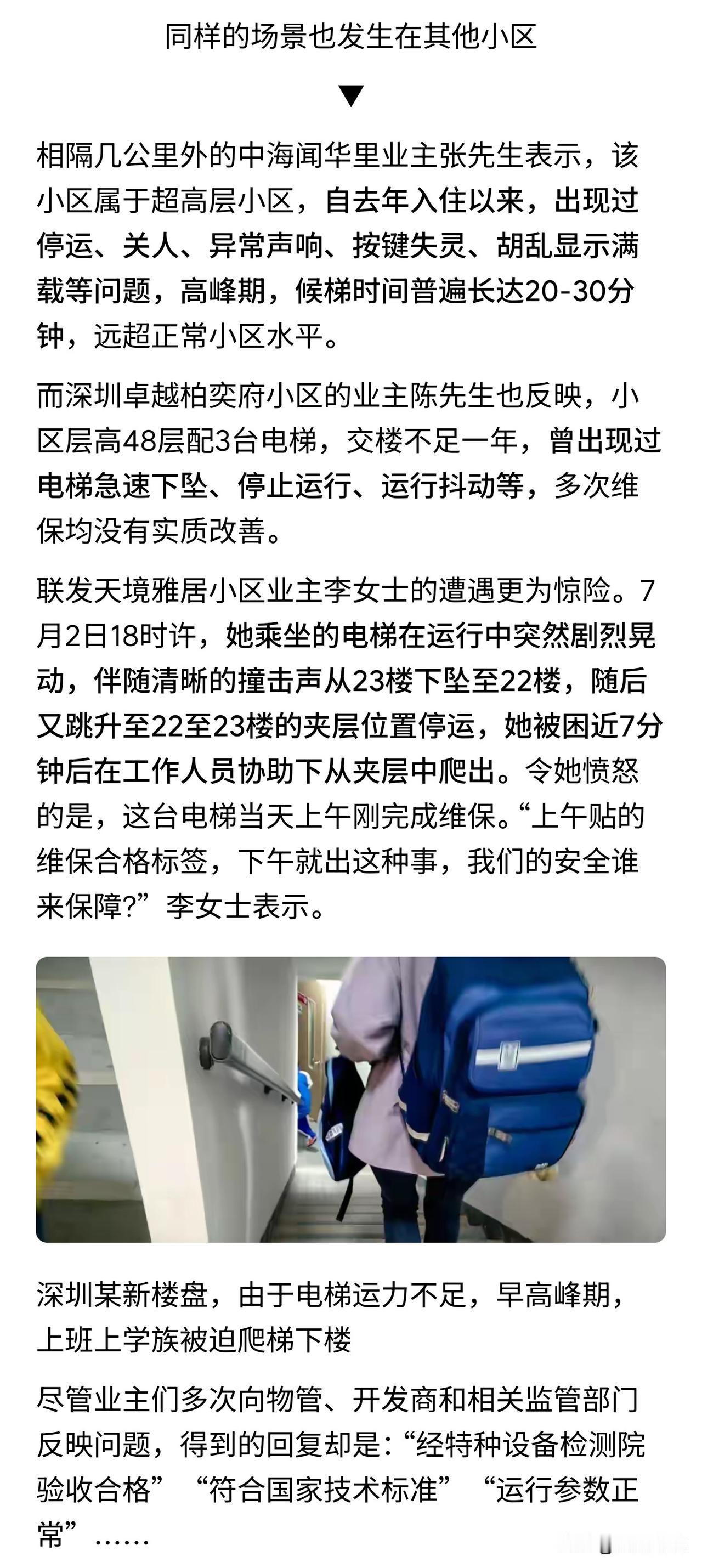 这是什么事啊!有电梯乘不了,还要走楼梯!心惊、心塞、心郁!甚至会突然下坠!业主经历惊魂一幕!还有人爬30楼回家!2梯6户33层,3梯6户45层!风景虽美,超高层住宅却遭遇现实难题! 尴尬的电梯楼,高峰期还要步行下楼上班上学!这是哪门子电梯房啊? 梯户比低,电梯少,住户多,造成电梯长时间超负荷运转,电梯故障时有发生,高层超高层住宅楼的问题越来越多! 关键这不是发生在老旧小区,也不是发生在三四线城市,而是发生在宇宙中心之一的大深圳,年轻而又富饶的新贵城市。有的该是刚入住不久的新房,也遭遇电梯频繁故障! 以后随着时间的推移,电梯经常超负荷运行,故障也会越来越多。本来20年才需要更换新电梯,可能只要10年就需要更换了,无异增加了居住成本。 这样的事情只会越来越多。 电梯
