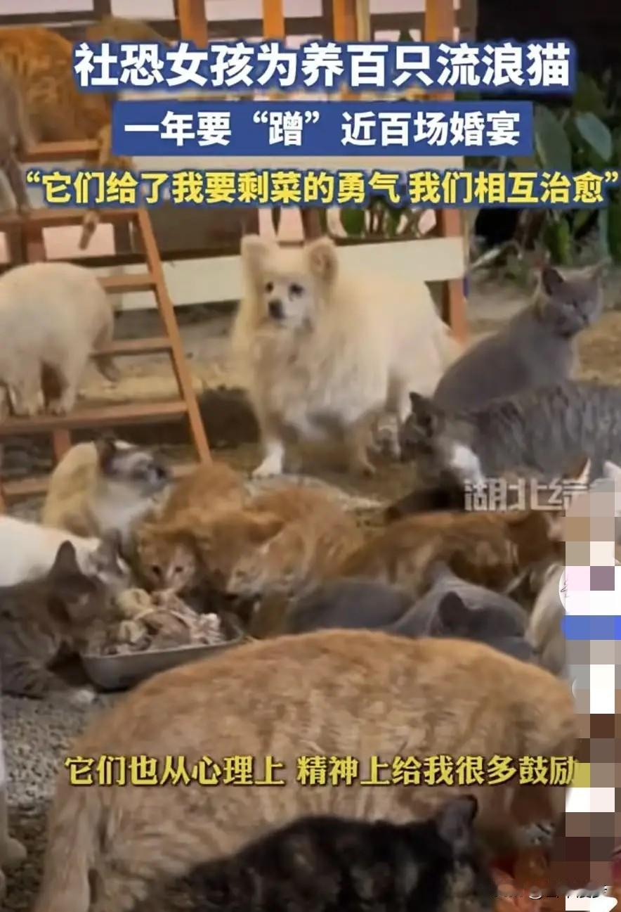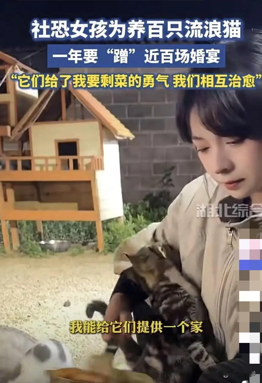 云南保山,一女子为了养活收养的120多只流浪猫,一年内“蹭”了近百场婚宴,她每次都提前向新人说明来意,并送上红包表示祝福,征得新人同意后,再等别人吃完去默默打包剩菜。网友:小猫世界的大英雄。 2022年冬天的保山街头,寒风裹着落叶打在脸上,27岁的宣宣下班路上,看见一只瘦得只剩皮包骨的小猫正啃着垃圾桶里的塑料袋,冻得缩成一团。 她心一揪,蹲下来轻轻把小猫抱进怀里,那点微弱的体温,让她从此踏上了流浪猫救助的路。 谁也没料到,这一抱就收不住了,从最开始的一两只,到后来邻居们送来的受伤小猫,再到自己在街头遇到的流浪毛孩子,一年多时间里,宣宣身边的流浪猫数量涨到了126只。 出租屋早就挤不下,她咬咬牙租下一个废弃养猪场,一点点改造成能遮风挡雨的收容所。 宣宣的工资不算高,可这些小猫每天的开销一点不含糊。 一只猫一天的伙食费就要三块钱,126只一天就是三百多,再加上时不时的体检、疫苗和绝育费用,每个月开销直奔两万块。 她试过下班后打零工,可挣来的钱连买猫粮都不够,常常看着空荡荡的粮桶发愁。 改变源于一次参加朋友婚宴的经历,那天宴席结束后,她路过后厨,看见工作人员正把一盘盘几乎没动过的清蒸鱼、白灼虾倒进泔水桶。 那些新鲜的食材让她瞬间想起收容所里饿肚子的小猫,一个念头突然冒了出来,这些好好的菜扔了可惜,要是能拿来喂猫多好。 她犹豫了很久,终于找到新人说明想法,没想到对方不仅同意,还帮她打包了好几份干净的菜,这次尝试让她看到了希望。 要知道,宣宣以前是个典型的社恐,跟陌生人说话都会脸红,可一想到家里等着吃饭的毛孩子,她还是硬着头皮学起了主动沟通。 每次听说有婚宴,她都会提前联系新人,说明自己想打包剩菜喂流浪猫的想法,还会送上一百块左右的红包,笑着说是“小猫们随的礼”。 到了婚宴现场,她从不凑到桌前,就安安静静在角落等着宾客散席。 打包时也很有分寸,专挑没动过的清淡菜品,避开重油重盐的菜,手脚麻利地装袋。 有一次,有人误以为她是来蹭吃蹭喝的,说的话不太好听,她委屈得眼圈都红了,可新人过来帮她解了围,还特意给她装了些新菜,这份温暖让她更坚定了。 每次从婚宴回来,不管多晚多累,宣宣第一件事就是处理这些剩菜。 她会把菜倒进大盆里,用清水一遍遍地淘洗,直到盆里的水变得清澈,再倒进锅里加水煮沸,这样既能去除残留的调料,又能杀菌。 煮好后还要耐心地把鱼刺、虾壳一根根挑出来,凉透后再和猫粮搅拌均匀。 她一直记着兽医的话,剩菜只能作为加餐,主食必须是猫粮才能保证营养,这样处理下来,每月能省下一千多元,刚好够给小猫们做体检和疫苗。 慢慢的,宣宣的事被越来越多人知道。 本地的酒店和婚庆公司都愿意帮她留意婚宴信息,不少新人还会主动邀请她去打包,说“有小猫来沾喜气更热闹”。 网友们也被她打动,有人寄来猫粮,有人特意赶来想领养小猫,还有同样救助流浪动物的人跟她交流经验。 宣宣会拍视频记录照顾小猫的日常,镜头里的她给小猫换粮、梳毛,眼里全是温柔。 她常说,不是自己在拯救小猫,是这些小猫给了她勇气,这是互相治愈的过程。 宣宣的故事之所以能引起共鸣,正是因为它戳中了很多人对流浪动物救助的纠结。 大多数人看到流浪的毛孩子都会心生怜悯,可一想到高昂的开销和无尽的精力就望而却步。 宣宣没有豪言壮语,也没有惊天动地的举动,只是用“送红包换剩菜”这种最朴素的方式,既照顾了小猫,又尊重了别人,让善意有了最舒服的表达方式。 如今的宣宣依然过着连轴转的生活,每天凌晨就起床,先去收容所给小猫换猫砂、添水,把煮好的剩菜和猫粮拌好分进食盆,忙完这些再赶去上班。 下班后又马不停蹄地回收容所,给小猫梳毛、检查身体。 她的故事传开后,不少小区居民自发组织起来,设立了流浪猫投喂点,还联系宠物医院定期给流浪猫做绝育,这些细微的变化,都藏着她带来的影响。 真正的善良从来不是轰轰烈烈的宣言,而是藏在日复一日的坚持里。 宣宣用自己的方式,让126只流浪猫有了温暖的家,也让自己从胆小的姑娘变成了勇敢的守护者。 希望这份带着分寸和尊重的善意能被更多人看见,让更多人愿意伸出手,给那些流浪的小生命一点温暖。