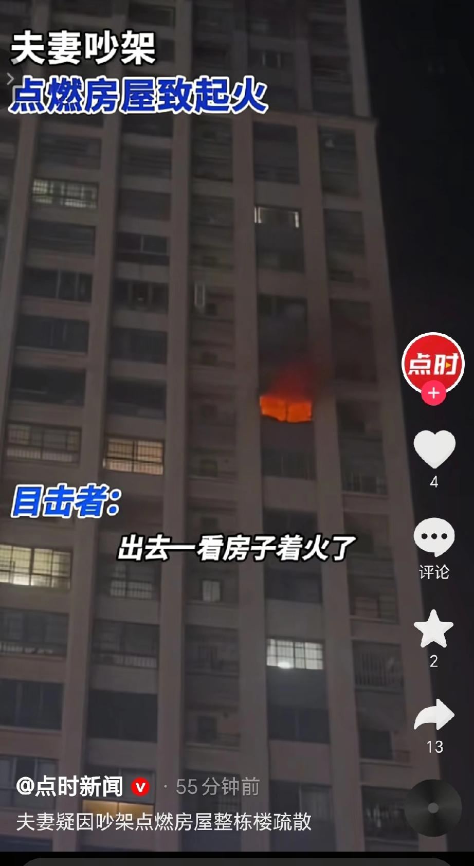 2025年12月1日湖南长沙某小区。夫妻因因争吵情绪失控,点燃房屋引发火灾。两人最初在小区幼儿园门口发生争吵,后返回家中,一方因情绪激动点燃房屋。事故未造成人员伤亡,涉事女方已被警方带走处理,整栋楼居民紧急疏散。在生活中遇到矛盾和冲突时,理性控制情绪至关重要。(图片来源于网络)