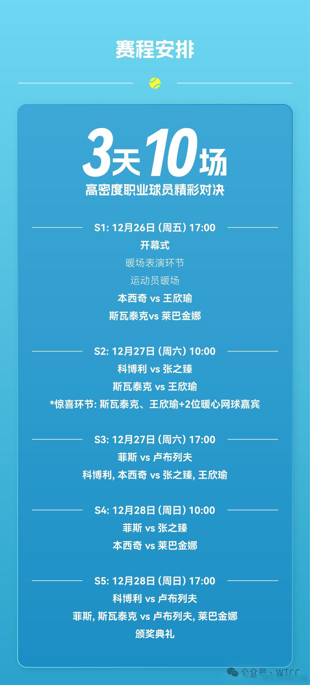 今天凌晨,WTCC(世界网球洲际对抗赛)官宣深圳站阵容以及赛程安排,深圳的小伙伴们准备好了么,又是家门口的顶级赛事。网球talking大会 ✅欧洲队:大满贯冠军斯瓦泰克领衔,科博利、菲斯(可能不来),以及奥运冠军本西奇齐聚鹏城。✅世界队:新科总决赛冠军莱巴金娜ElenaRybakina 带队,张之臻、卢布列夫出战,大满贯双打冠军王欣瑜相约粤B。赛程方面,三天十场比赛,还有惊喜网球嘉宾出席,真的看得过瘾。