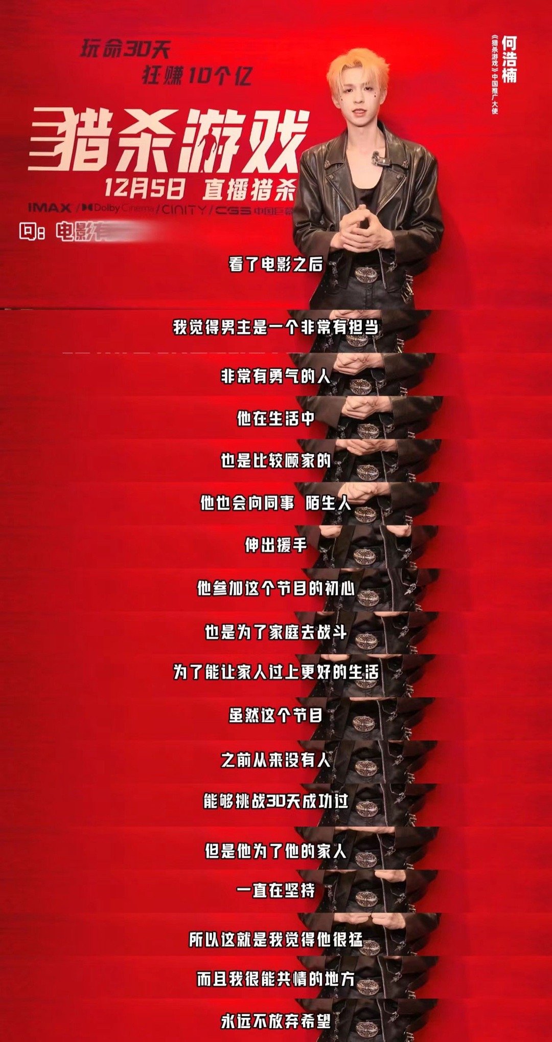 何浩楠何浩楠献唱猎杀游戏推广曲 后陡门车神这次带来全新惊喜,何浩楠用充满张力的烟嗓演绎猎杀游戏推广曲,将生存博弈的紧张氛围完美呈现。特辑片段已经让人热血沸腾,迫不及待想在影院感受这场视听盛宴何浩楠猎杀游戏中国推广曲特辑