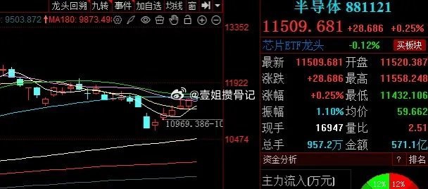 半导体上涨、窄幅震荡实为蓄力、随时有向上突破的动能!!!今天半导体指数呈现窄幅震荡走势,目前板块指数呈现小幅上涨态势,板块指数目前涨幅0.15%,板块内个股以上涨为主。从技术上来看,目前位置是有60、30两条中期均线压制,最主要是是这个位置是前期大的箱体下轨,有大量的套牢盘。半导体指数以窄幅震荡为主,这样的走势是以消化上方套牢盘为目的。短期内半导体指数是有实力向上突破的。