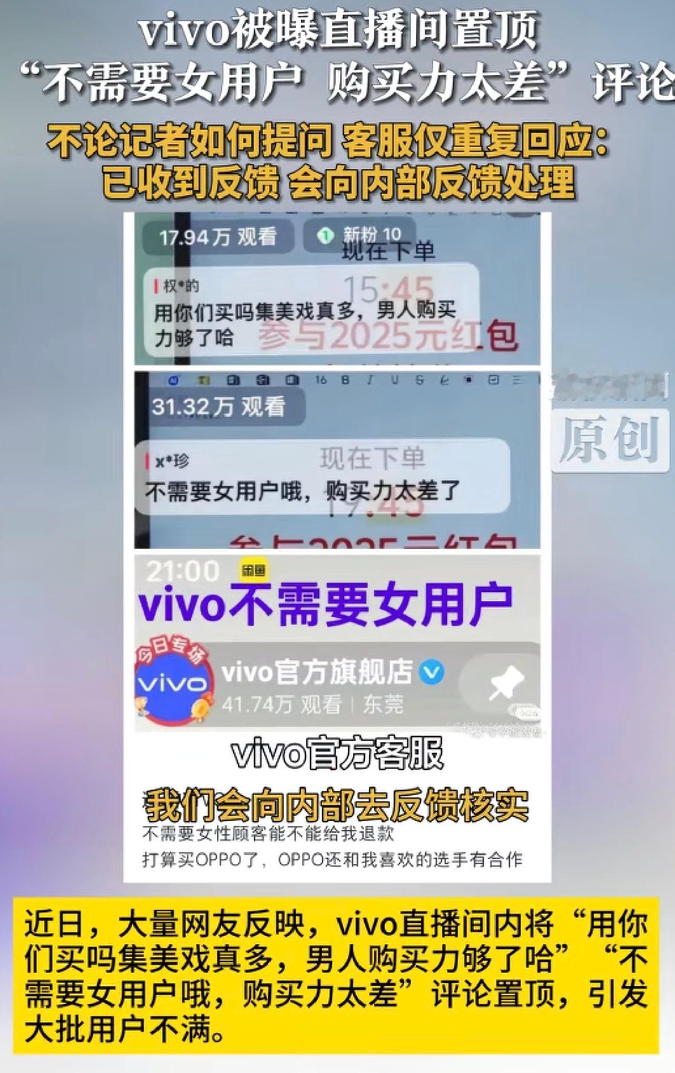 vivo 女性用户 ov两家应该是最在意女性用户的品牌了吧,为啥官方直播间会置顶这条内容呢身边大部分女性朋友10个有5个都在用vivo的X系列,拍照人像好,系统也流畅。等后续看看官方是咋说的吧