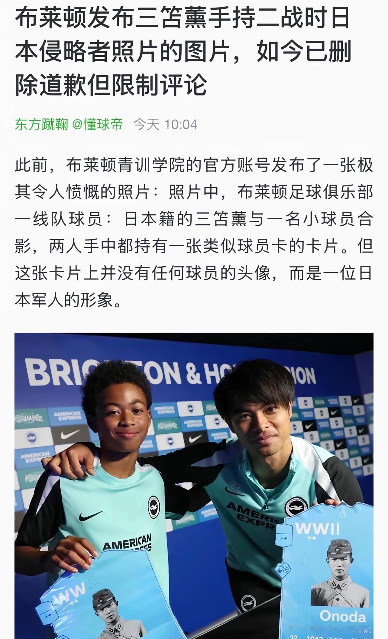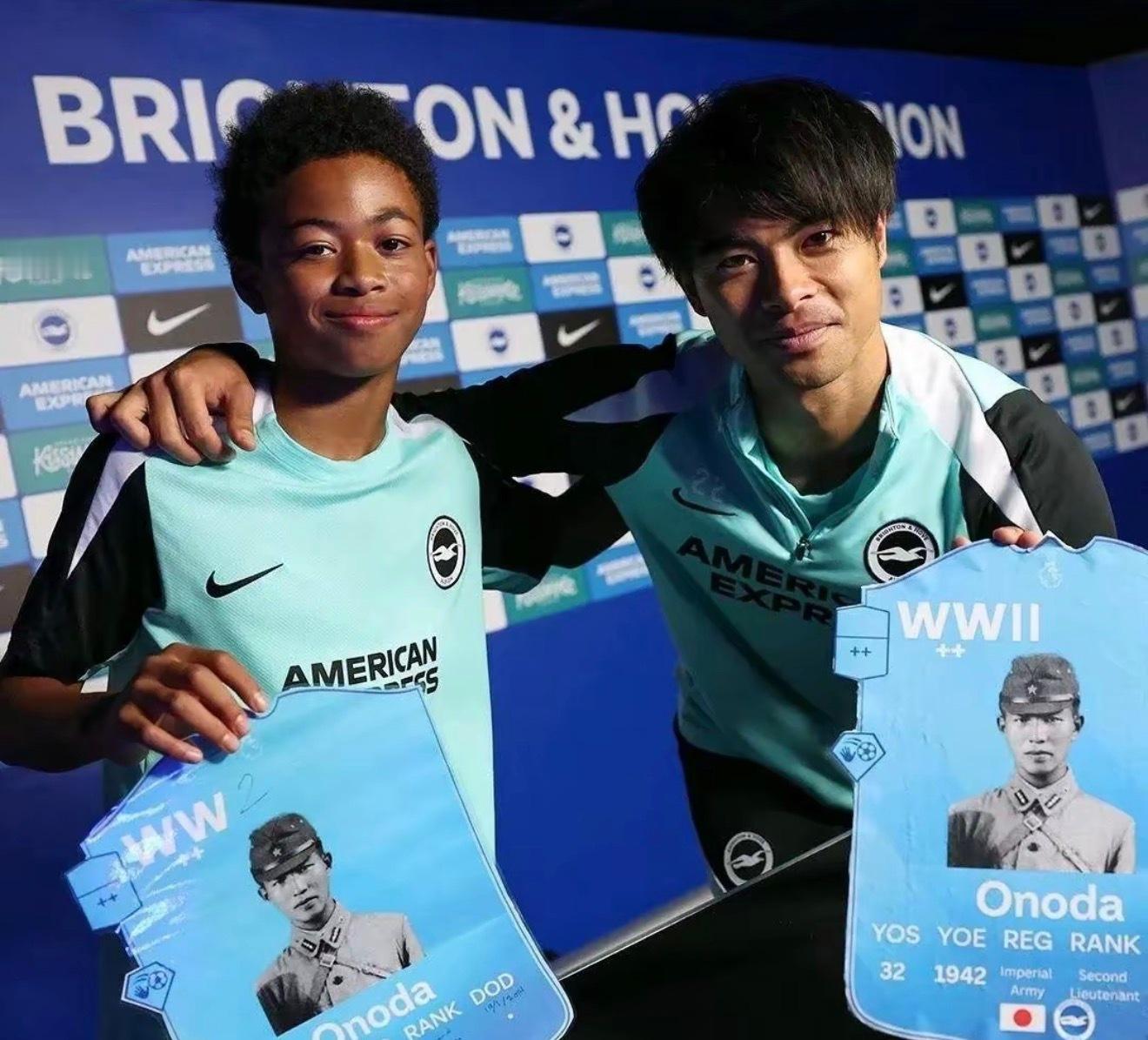 英超日本国脚手持日军军官卡片合影手持的这张照片里面的人是最后一个投降那个日本鬼子,130多名菲律宾人伤亡还拒绝认错我建议他可以举一下蘑菇云的照片 英超球队向中国球迷道歉
