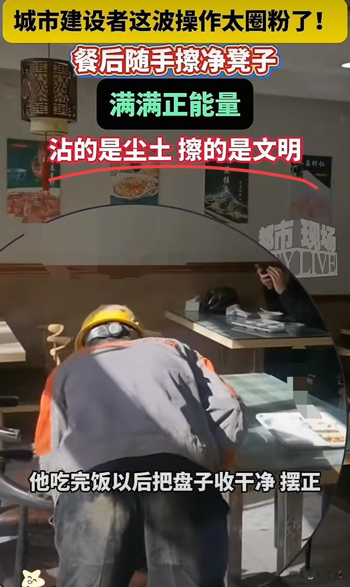 莫名其妙的爆泪!上海,一农民工大叔在一家餐馆吃完饭后,顺手抽张纸巾就蹲下身,把自己坐过的椅子擦得干干净净,没找到垃圾桶就把废纸叠得整整齐齐放桌角,这份藏在细节里的体面,真的太戳心了! 总有人戴着有色眼镜,觉得干体力活的人“不体面”,可他们忘了,真正的干净从不在衣着上! 大叔挣的是凭力气换来的踏实钱,做的是替人着想的暖心事,这份刻在骨子里的教养,比多少光鲜亮丽的外表都金贵! 我们常说文明,其实文明从不是高楼大厦的气派,而是底层劳动者被看见的善意,是不愿麻烦别人的自觉! 那些进餐馆前拍掉身上尘土、悄悄坐在角落的人,他们顾及着别人的感受,却总被少数人轻视! 真正的“脏”,从来不是身上的汗水和灰尘,而是看不起劳动者的偏见,是不懂体谅的傲慢! 大叔擦的是椅子,更是某些人心里的偏见。为这位大叔点赞!