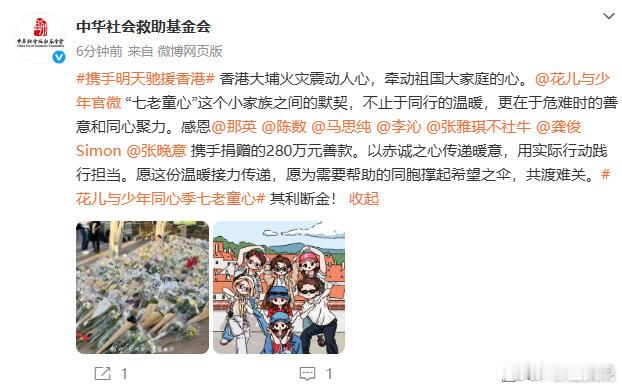 七老童心为香港同胞捐赠280万元携手捐赠的280万元善款。
