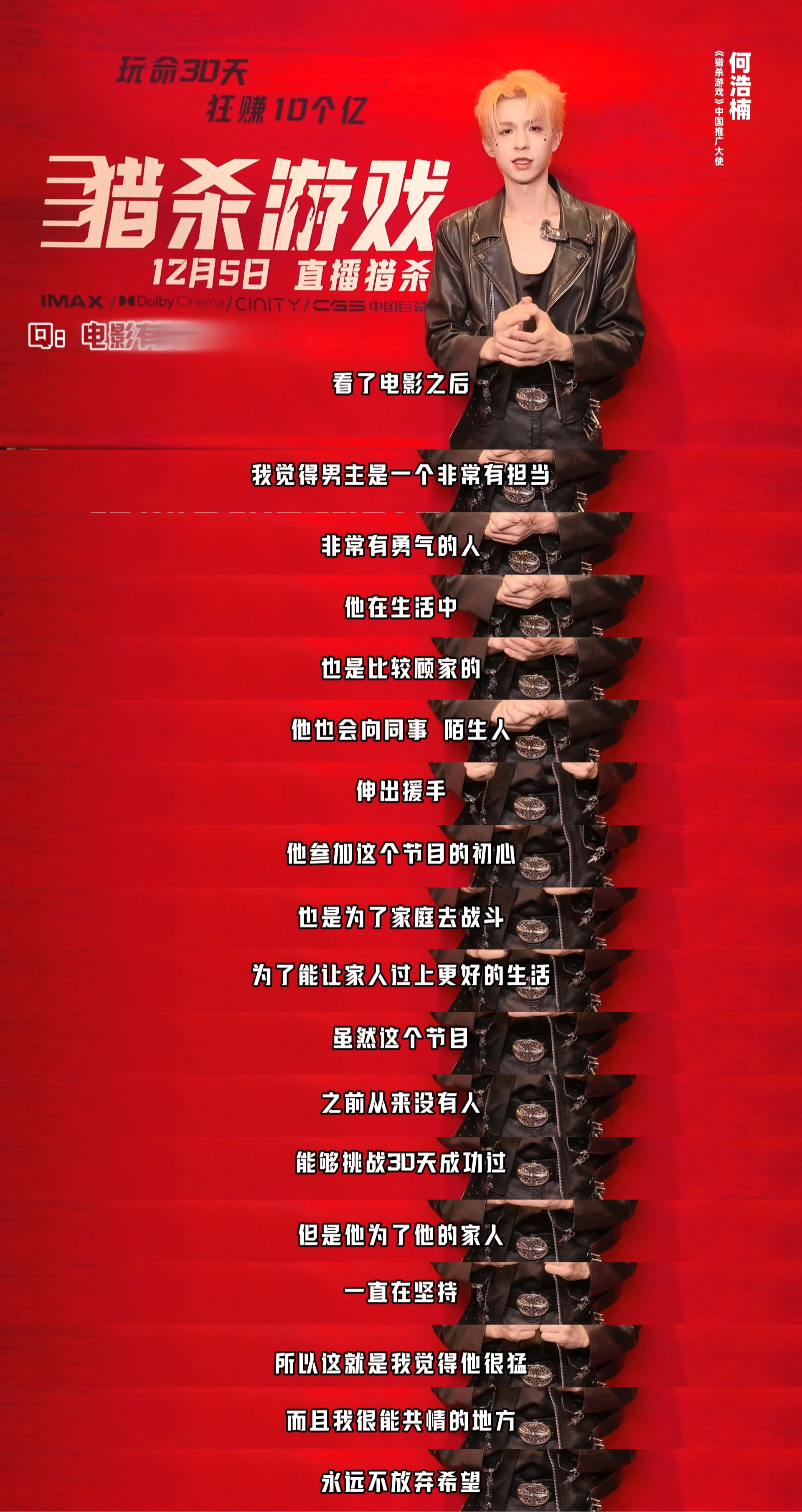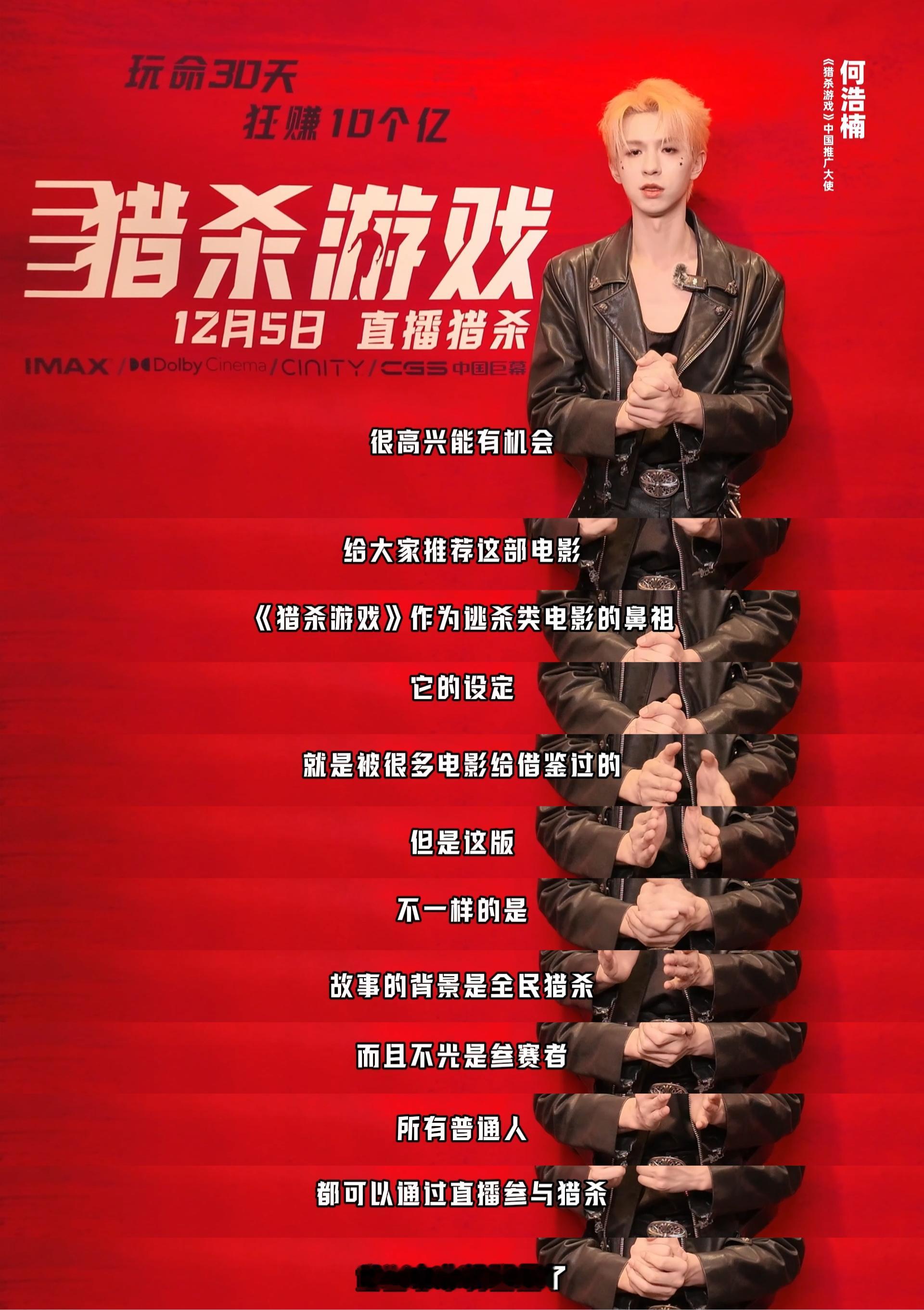 何浩楠献唱猎杀游戏推广曲 何浩楠猎杀游戏中国推广曲特辑我们好厉害啊,热血献声《猎杀游戏》!歌声和电影适配度太强了!引爆肾上腺素的中文推广曲,带你闯入生死竞速的猎杀迷局。极具穿透力的声线撕裂黑暗,高燃歌词化作绝境中的锋芒利刃——当追逐的脚步声与心跳同频,唯有向前奔跑才能破局重生!