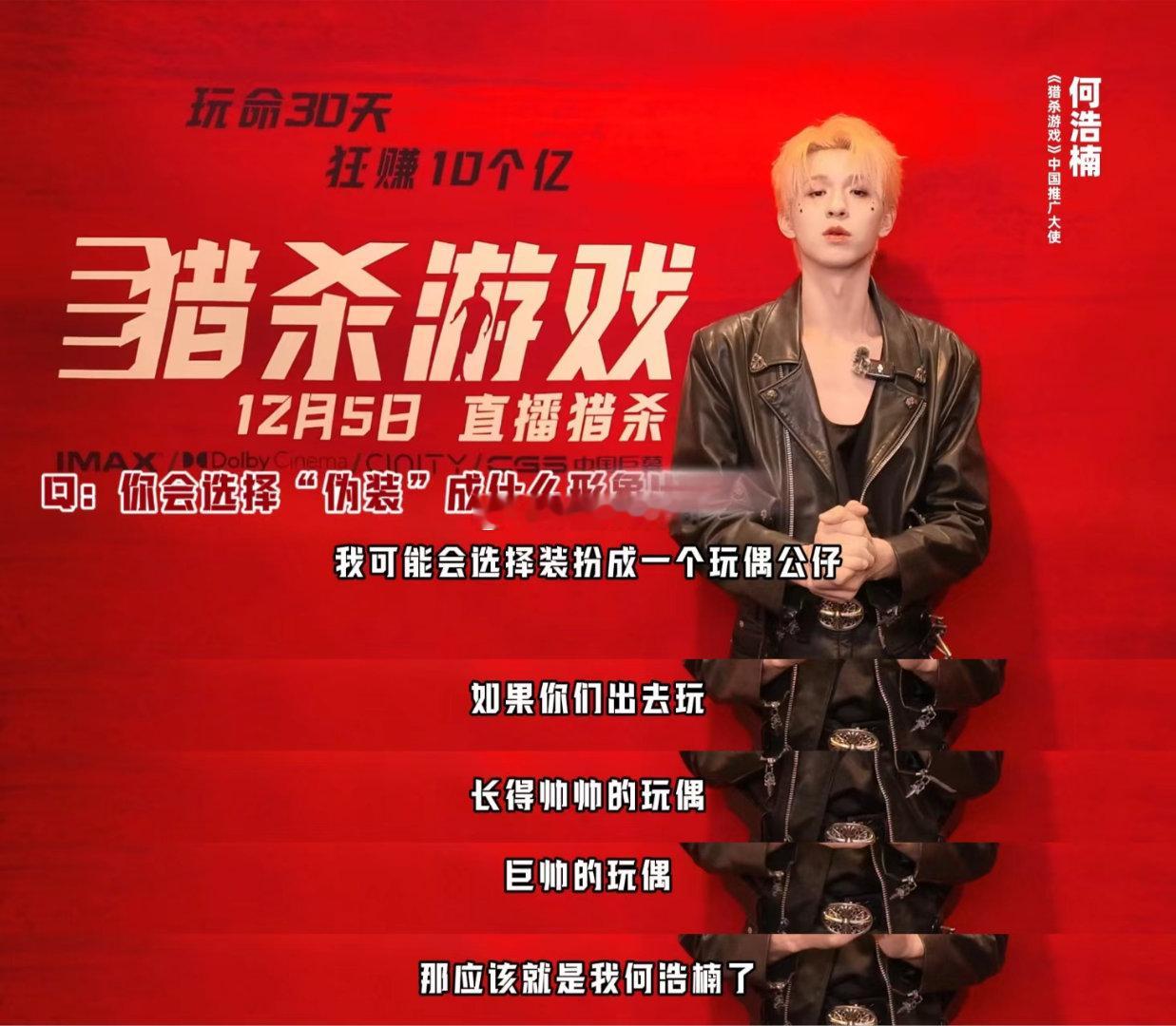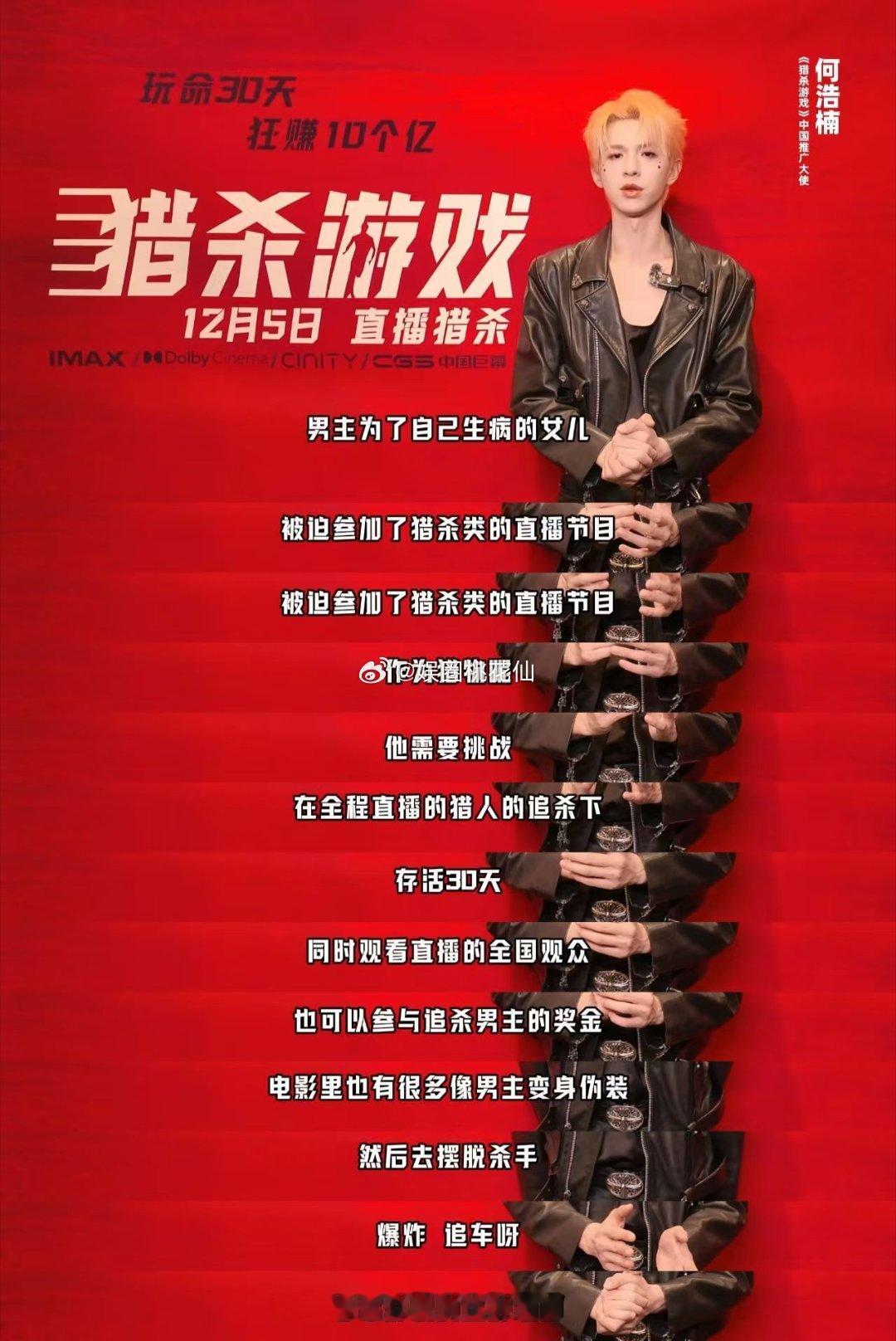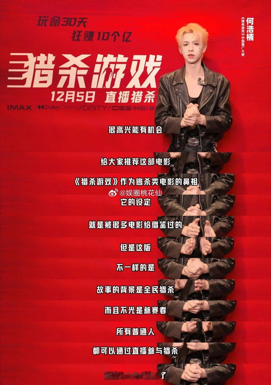 何浩楠何浩楠献唱猎杀游戏推广曲 何浩楠独特烟嗓自带故事感,把影片中真人秀猎杀的刺激,人性对决的深刻都演绎得淋漓尽致,热血唱腔搭配硬核剧情,影院里的视听冲击想想就上头,坐等正式上映何浩楠猎杀游戏中国推广曲特辑
