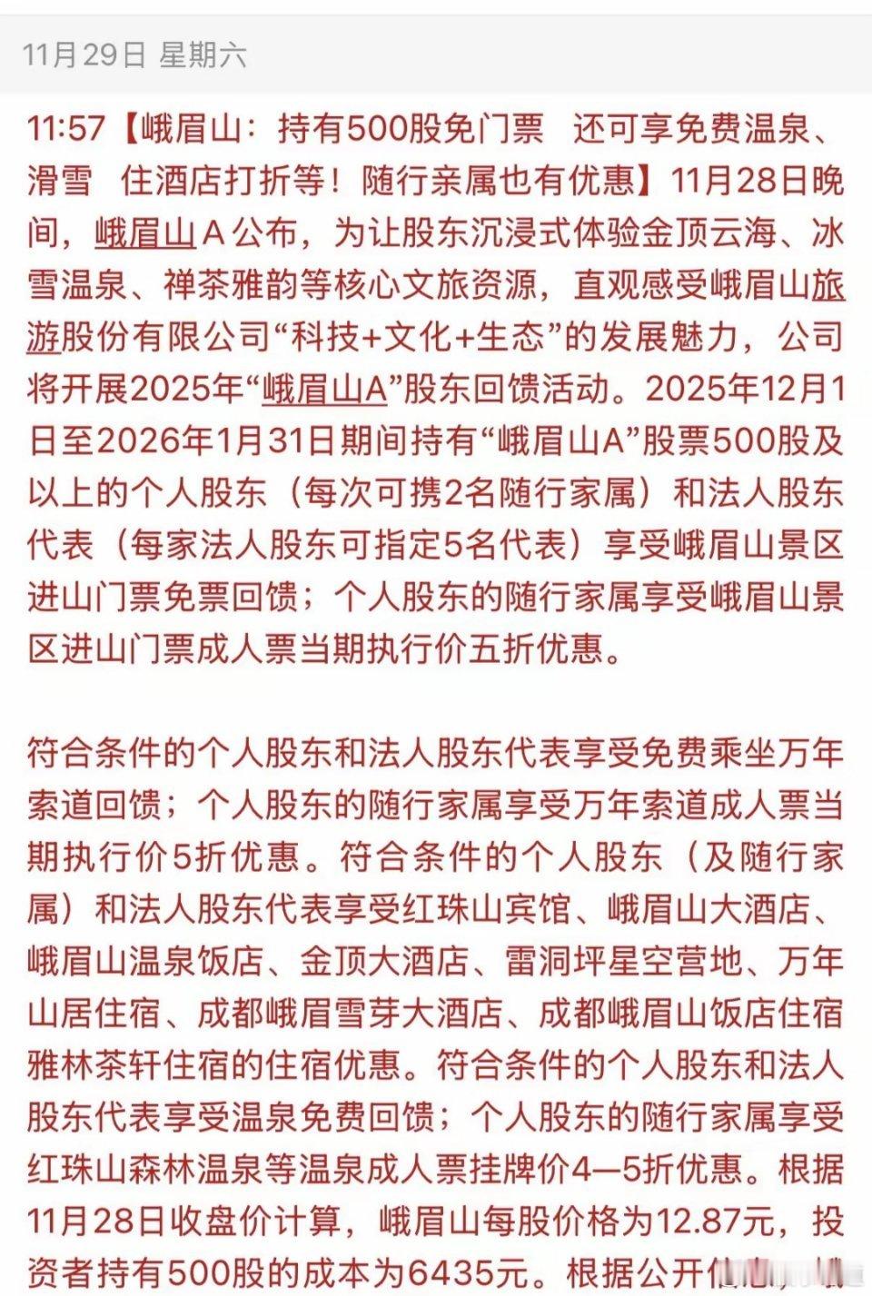 首个上市公司对持有该公司500股股票的投资者可以“免费门票、免费温泉、滑雪、住酒店打折,随行亲属也有优惠”。难得有上市公司的产品惠及自己的股东,真正做到了关爱中小股东权益,以投资者为本的好企业。现在市场上五千多家上市公司,应该好好向“峨眉山”公司学习,应该持有公司股票有中小股东投资享受该公司的产品优惠价购买。比如,贵州茅台,凡是持有茅台公司股票的投资都可以享受飞天茅台1499的价格,一年购买的数量由所持茅台股票数量所决定。由此参照,以此类推到快消品、家电、汽车和各类产品,一来可以促进更多的消费,二来上市公司对投资者的粘性更强,形成了产品销售有群体,上市股票有人投。希望监管层可以要求所有上市公司进行参考学习,促进良性市场生态环境,让股市越涨越有,股民投资者就不用担心股市下跌的风险。股事论道今日看盘股票