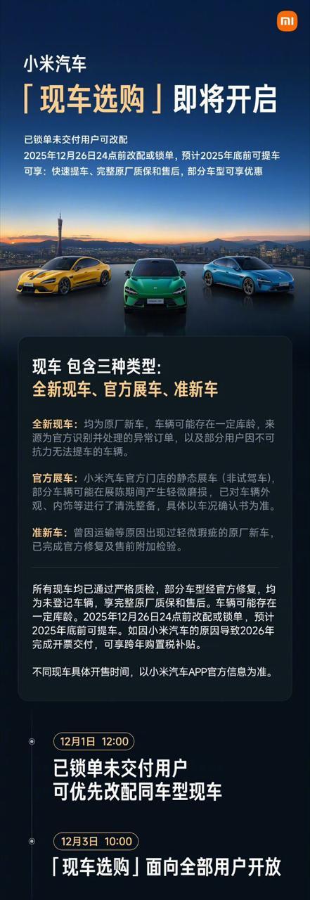 军都说了,他们的汽车很安全,粉丝们不支持一下?嘿,这看似呼吁支持的调侃话,背后却有个反常事儿。 小米汽车 APP 现车选购即将开启,这消息一出来,不少人兴奋不已,可也有人冷静思考,发现了些不一样的东西。 按说新功能开启、现车供应,该是皆大欢喜。但仔细瞧瞧,现车里包含官方展车和准新车,虽说官方宣称经严格质检、官方修复,可消费者心里难免犯嘀咕:这些车之前经历过啥?会不会有啥潜在问题没被完全发现?毕竟汽车安全可不是小事,哪怕是小瑕疵,也可能带来大隐患。 不过咱也别光盯着问题看。小米汽车积极开启现车选购,给消费者更多选择,还提供快速提车、完整质保售后等服务,这努力和诚意还是值得肯定的。 希望大家在支持国产汽车发展的同时,也能理性看待,督促企业把好质量关。相信在大家的监督下,国产汽车会越来越好,一路“狂飙”!