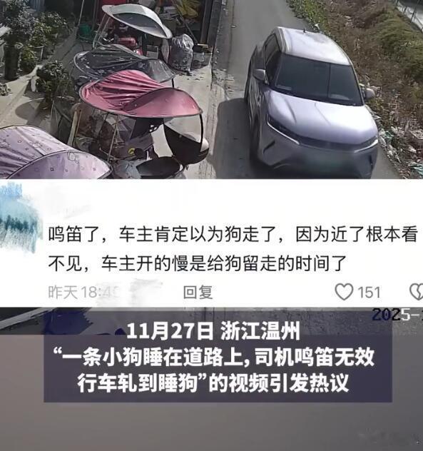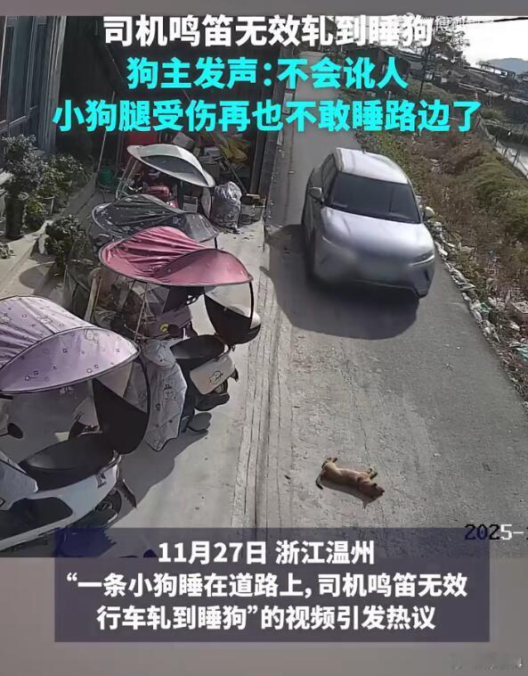 狗子在道路上熟睡,司机开车路过鸣笛,但狗子没反应,于是司机直接开过去了,压伤了狗子的腿。这件事,其实道理很简单:不栓绳的狗、散养的狗,就没有路权,一旦发生碰撞也是司机无责,狗主人还要赔偿车主。而这位狗主人也还是挺有素养的,说“没打算讹人”。有言道“好狗不挡路”,狗子是无辜的,但很多狗主人就是不懂这个道理呢~ 司机鸣笛无效轧到睡狗狗主回应司机鸣笛无效轧到睡狗