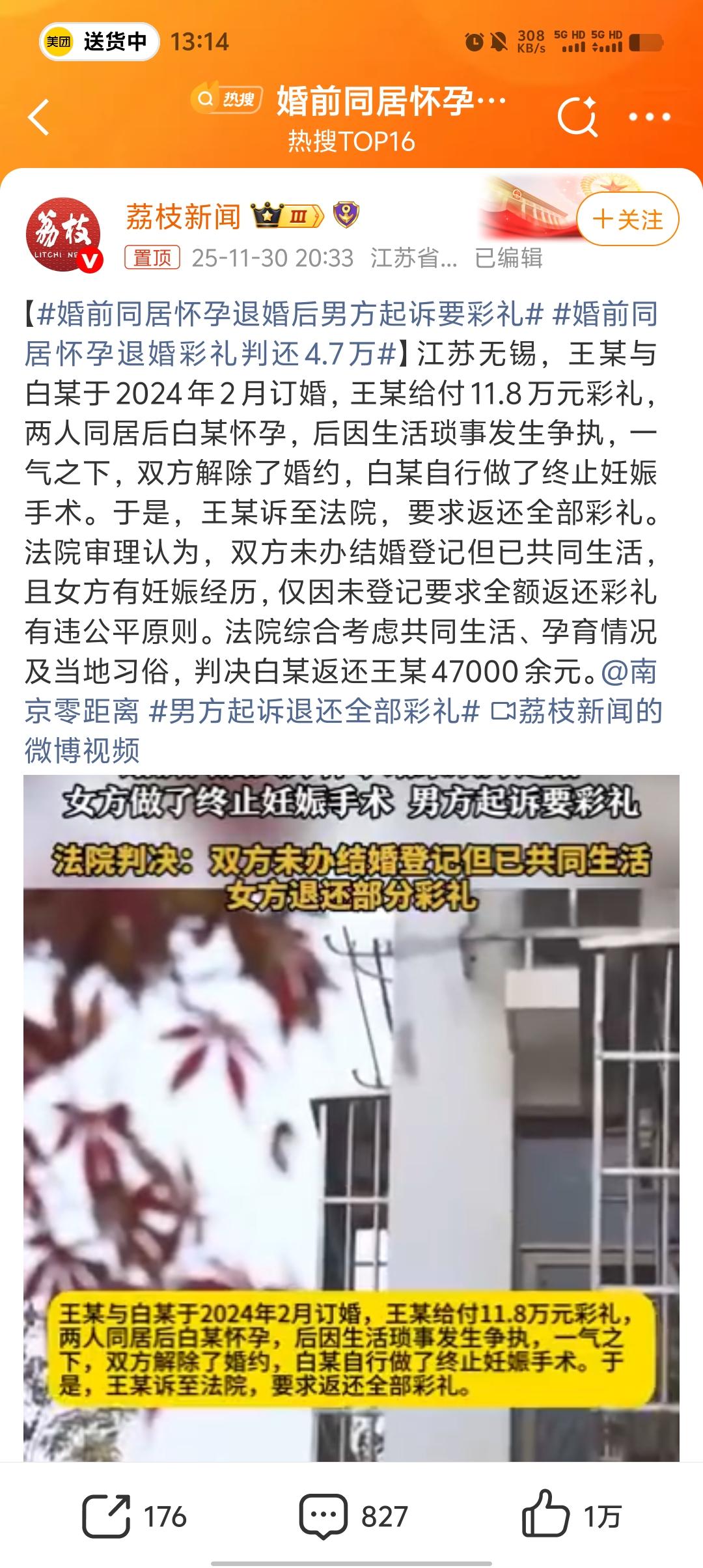 江苏无锡一对情侣订婚后,男方给了11.8万彩礼,同居后女方怀孕,结果因为生活琐事闹掰了——女方自己做了终止妊娠手术,男方转头就把她告了,要全额退彩礼! 没全退,只让女方还4.7万!理由是“俩人已经共同生活,女方还有妊娠经历,全额退太不公平”。