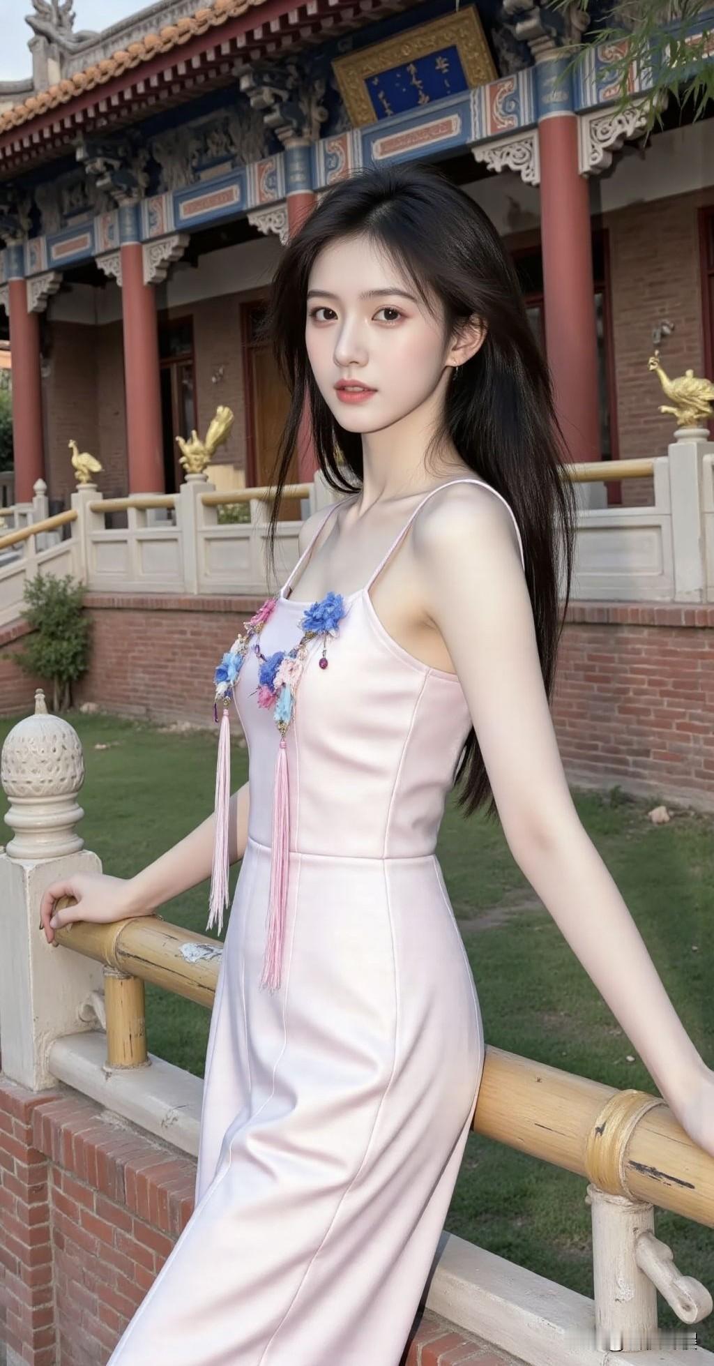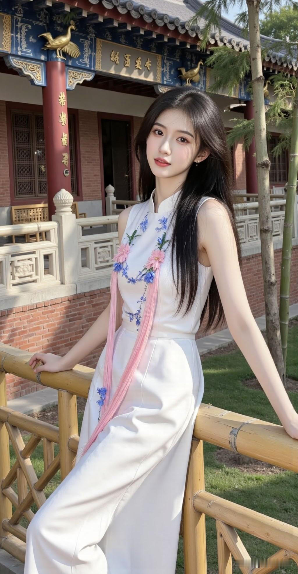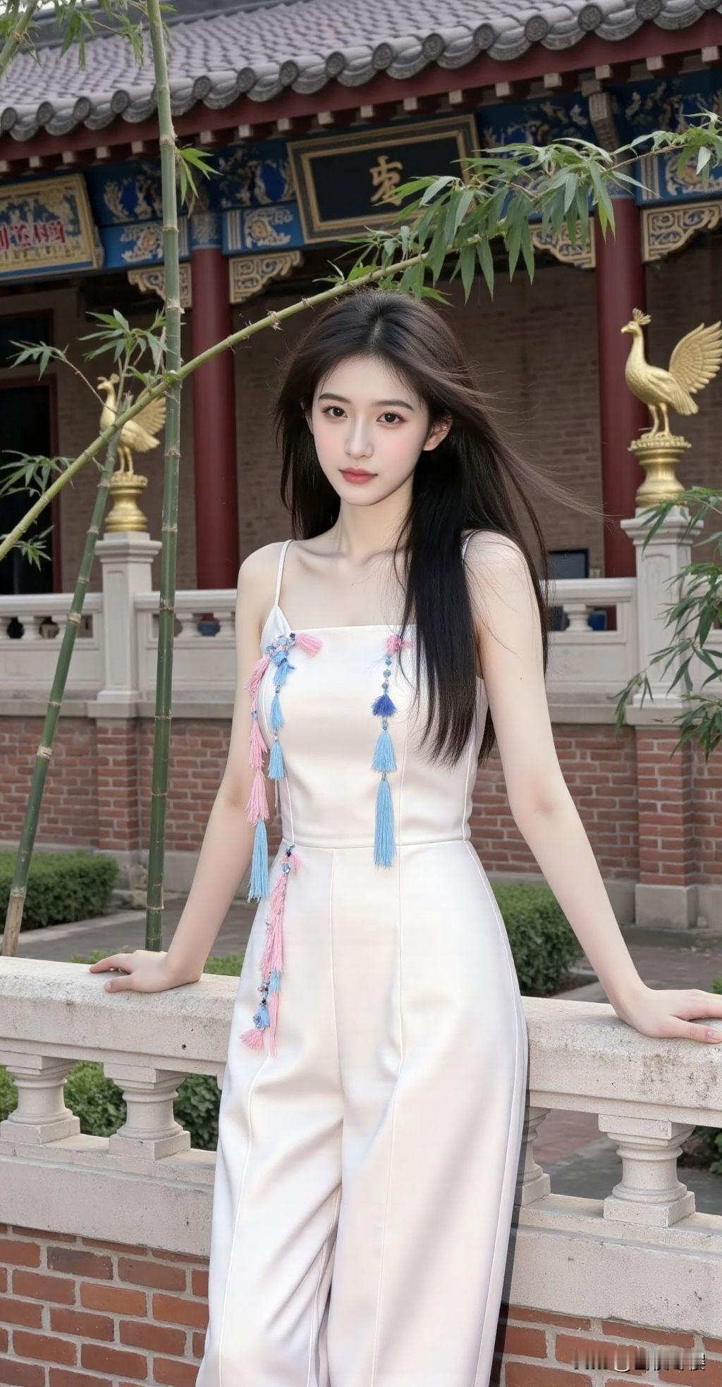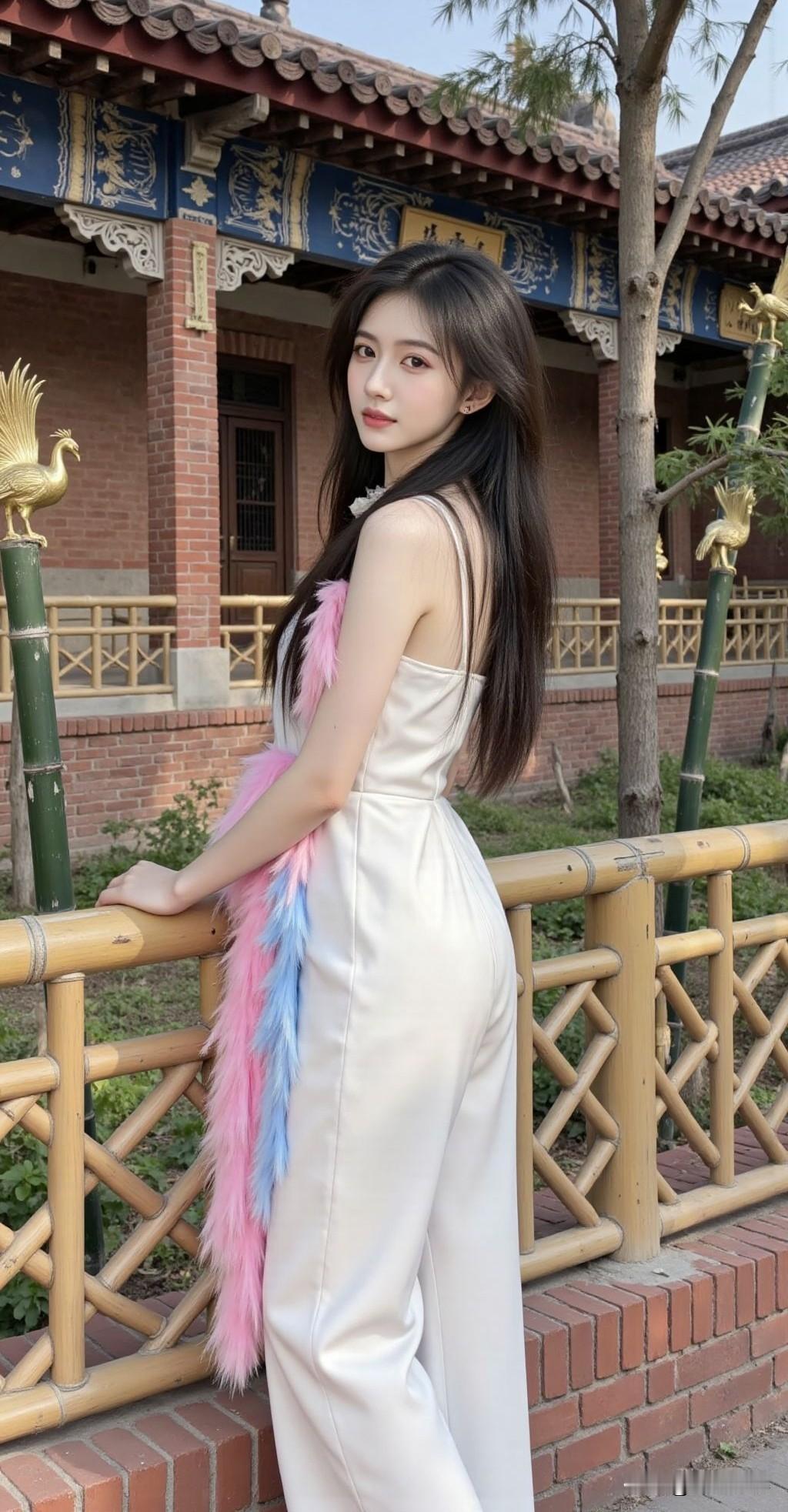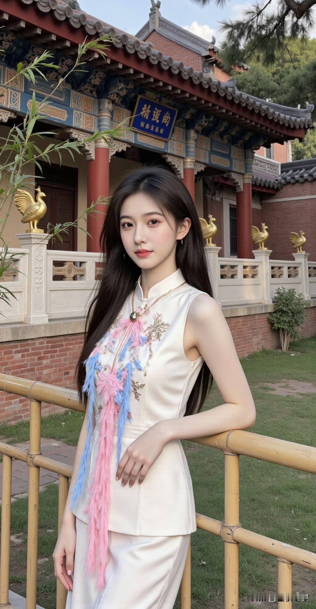 姑娘穿着现代裤装旗袍倚在栏杆旁, 那画面真的绝了! 现代裤装与传统旗袍的结合, 既保留了旗袍的韵味, 又多了份现代的利落。 想象一下,在公园的凉亭边, 她就那么静静地凝视着, 宛如大家闺秀,优雅又温润。 要是这时候拿起相机拍拍照, 远景能展现她在环境中的姿态; 中景让背景与之映衬,美极了; 近景她低头含笑或者侧脸回眸, 凌乱发丝都增添别样风情。 这一身装扮加上合适的场景, 简直就是一幅流动的画卷, 美到让人移不开眼。 新中式旗袍美女