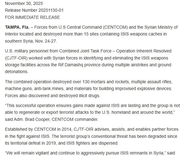 美军宣称与叙利亚HTS政权合作,在大马士革乡村省摧毁了15个“IS武器仓库”,不过没有公布任何证据。