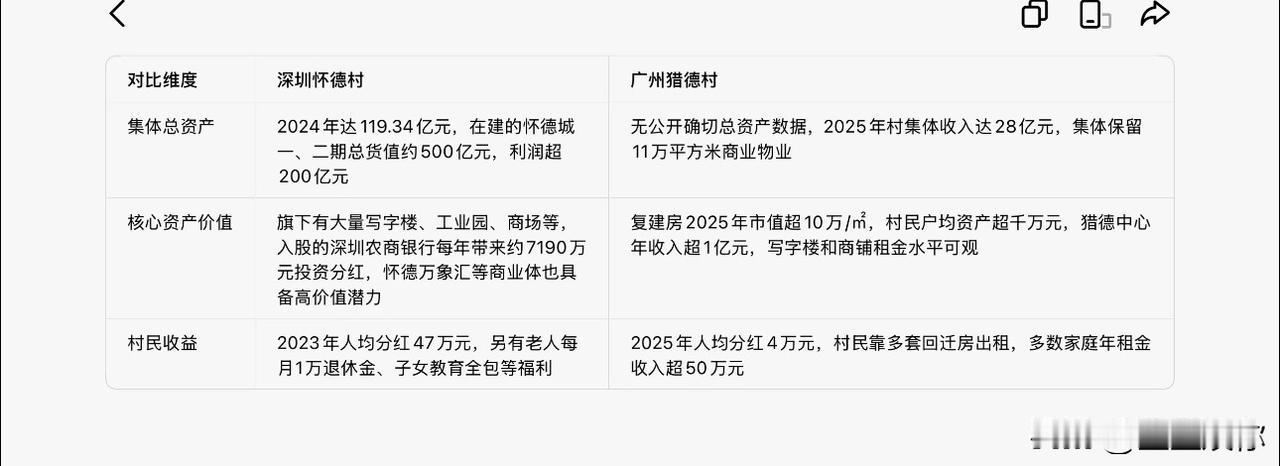 都说深圳有怀德,广州有猎德。 其实两者不在一个维度,资产规模深圳怀德村是广州猎德村的20倍左右。怀德村早期规划比较超前,不靠卖地全部入股,所以越滚越大,村入股名下的上市公司和专精特新企业就有十几家,市值超千亿规模,国内第一没有其他。村民人均分红也是猎德的10多倍。