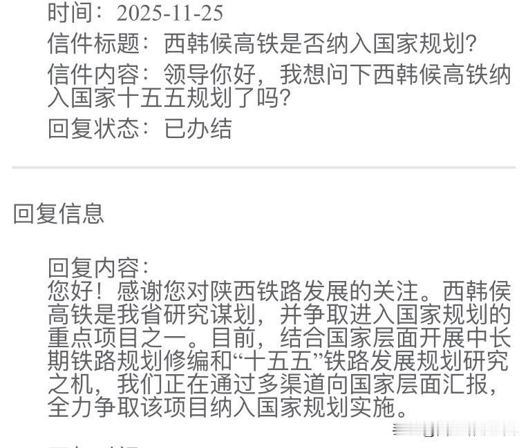 西韩侯高铁最新进展:暂未入列“十五五”,陕晋正联合全力争取 关注西韩侯高铁的朋友注意了!最新消息显示,这条连接陕西、山西的重要通道目前尚未正式纳入国家“十五五”铁路发展规划,但正处于积极推进的关键阶段。 根据陕西省发改委2025年11月26日的官方回复,西韩侯高铁是陕西重点谋划并全力争取入规的项目。当前,陕西正借国家中长期铁路规划修编、“十五五”铁路规划研究的契机,多渠道向国家层面汇报,力争推动项目落地;同时,陕晋两省已开启联合推动模式,共同争取将其纳入《中长期铁路网规划(2035年)》及“十五五”规划,沿线土地预留、线路勘察等前期工作也已同步开展。 这条高铁若能顺利规划建设,将进一步加密晋陕区域铁路网,对两地经济联动、人员往来意义重大。