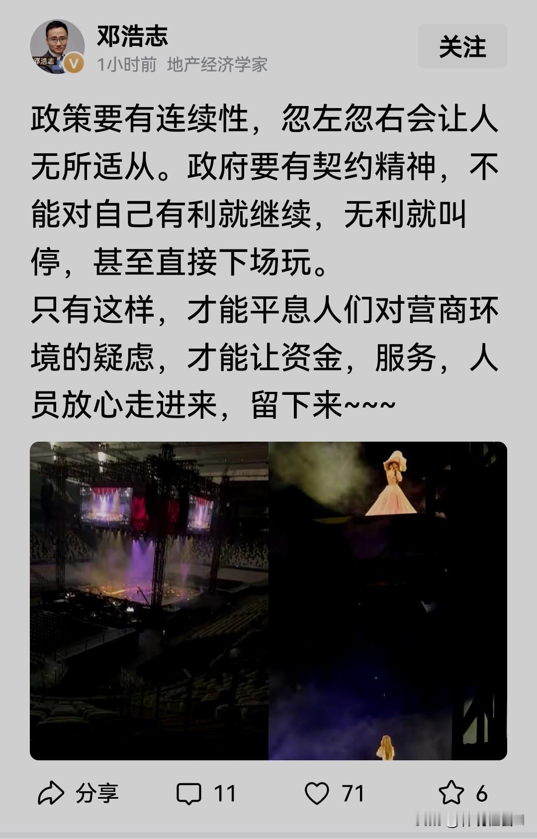 14000人的大厅空荡荡的,舞台上只有一个人唱歌秀演技,你唱的再好听,如果没有观众看,这有什么意义? 是的,政策要有连续性,忽左忽右会让人无所适从。政府要有契约精神,不能对自己有利就继续,无利就叫停,甚至直接下场玩。 日本政府的契约精神在哪里?叫嚣台湾有事就是日本有事,这就是对我们整个民族释放敌意!日本帝国主义的侵略历史,他们自己忘记,我们不能忘记! 如果这位歌星感觉委屈,只能埋怨他们的女首相高市早苗,胡言乱语破坏二战结束后形成的国际秩序。