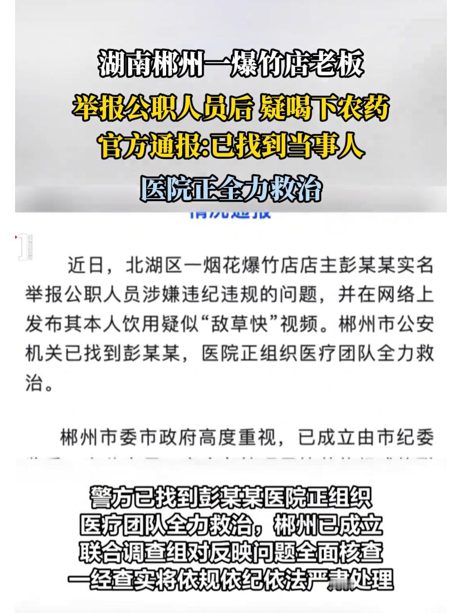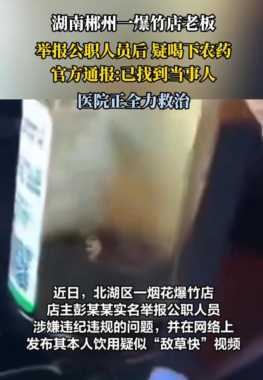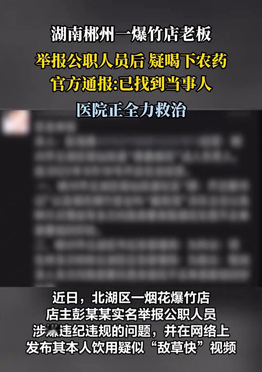 官方通报店主实名举报公职人员湖南郴州店主彭某某的极端选择,让人心痛又沉重。疑似因经营许可审批受阻、存货积压,他实名反映问题后,喝下剧毒农药以命相搏,目前正被全力抢救。